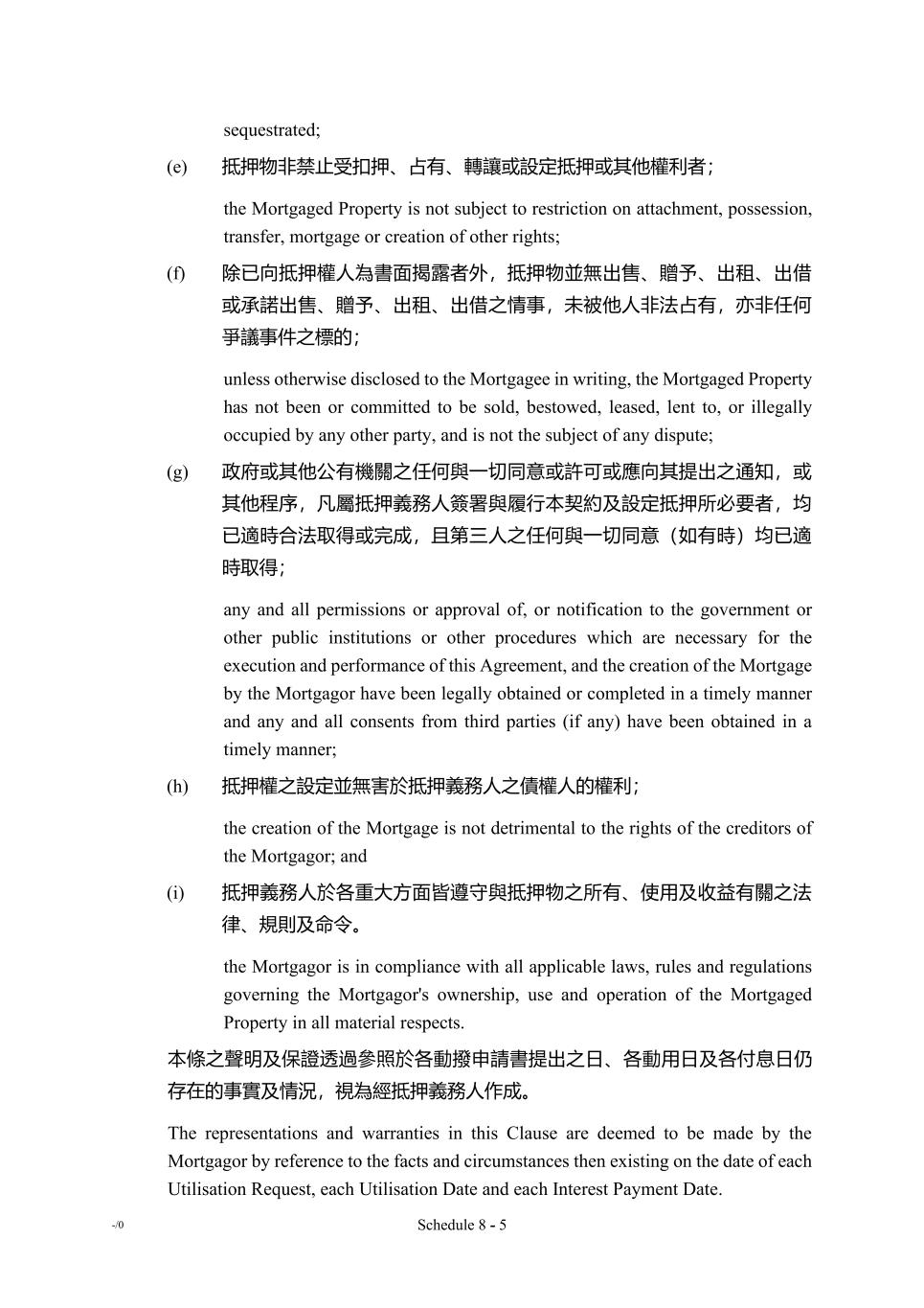 -/0 Schedule 8 - 5 sequestrated; (e) 抵押物非禁止受扣押、占有、轉讓或設定抵押或其他權利者; the Mortgaged Property is not subject to restriction on attachment, possession, transfer, mortgage or creation of other rights; (f) 除已向抵押權人為書面揭露者外,抵押物並無出售、贈予、出租、出借 或承諾出售、贈予、出租、出借之情事,未被他人非法占有,亦非任何 爭議事件之標的; unless otherwise disclosed to the Mortgagee in writing, the Mortgaged Property has not been or committed to be sold, bestowed, leased, lent to, or illegally occupied by any other party, and is not the subject of any dispute; (g) 政府或其他公有機關之任何與一切同意或許可或應向其提出之通知,或 其他程序,凡屬抵押義務人簽署與履行本契約及設定抵押所必要者,均 已適時合法取得或完成,且第三人之任何與一切同意(如有時)均已適 時取得; any and all permissions or approval of, or notification to the government or other public institutions or other procedures which are necessary for the execution and performance of this Agreement, and the creation of the Mortgage by the Mortgagor have been legally obtained or completed in a timely manner and any and all consents from third parties (if any) have been obtained in a timely manner; (h) 抵押權之設定並無害於抵押義務人之債權人的權利; the creation of the Mortgage is not detrimental to the rights of the creditors of the Mortgagor; and (i) 抵押義務人於各重大方面皆遵守與抵押物之所有、使用及收益有關之法 律、規則及命令。 the Mortgagor is in compliance with all applicable laws, rules and regulations governing the Mortgagor's ownership, use and operation of the Mortgaged Property in all material respects. 本條之聲明及保證透過參照於各動撥申請書提出之日、各動用日及各付息日仍 存在的事實及情況,視為經抵押義務人作成。 The representations and warranties in this Clause are deemed to be made by the Mortgagor by reference to the facts and circumstances then existing on the date of each Utilisation Request, each Utilisation Date and each Interest Payment Date.