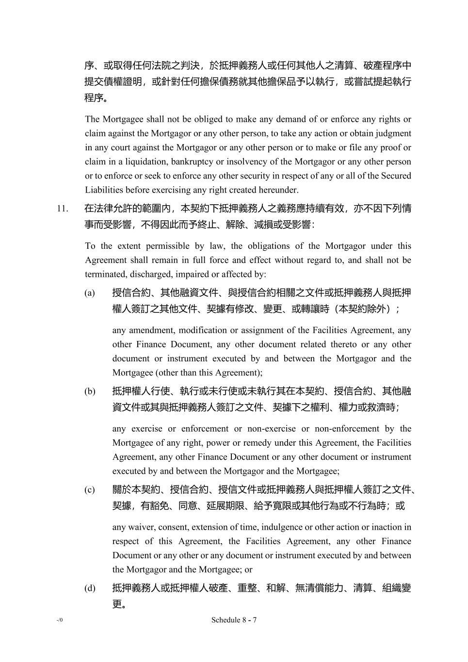 -/0 Schedule 8 - 7 序、或取得任何法院之判決,於抵押義務人或任何其他人之清算、破產程序中 提交債權證明,或針對任何擔保債務就其他擔保品予以執行,或嘗試提起執行 程序。 The Mortgagee shall not be obliged to make any demand of or enforce any rights or claim against the Mortgagor or any other person, to take any action or obtain judgment in any court against the Mortgagor or any other person or to make or file any proof or claim in a liquidation, bankruptcy or insolvency of the Mortgagor or any other person or to enforce or seek to enforce any other security in respect of any or all of the Secured Liabilities before exercising any right created hereunder. 11. 在法律允許的範圍內,本契約下抵押義務人之義務應持續有效,亦不因下列情 事而受影響,不得因此而予終止、解除、減損或受影響: To the extent permissible by law, the obligations of the Mortgagor under this Agreement shall remain in full force and effect without regard to, and shall not be terminated, discharged, impaired or affected by: (a) 授信合約、其他融資文件、與授信合約相關之文件或抵押義務人與抵押 權人簽訂之其他文件、契據有修改、變更、或轉讓時(本契約除外); any amendment, modification or assignment of the Facilities Agreement, any other Finance Document, any other document related thereto or any other document or instrument executed by and between the Mortgagor and the Mortgagee (other than this Agreement); (b) 抵押權人行使、執行或未行使或未執行其在本契約、授信合約、其他融 資文件或其與抵押義務人簽訂之文件、契據下之權利、權力或救濟時; any exercise or enforcement or non-exercise or non-enforcement by the Mortgagee of any right, power or remedy under this Agreement, the Facilities Agreement, any other Finance Document or any other document or instrument executed by and between the Mortgagor and the Mortgagee; (c) 關於本契約、授信合約、授信文件或抵押義務人與抵押權人簽訂之文件、 契據,有豁免、同意、延展期限、給予寬限或其他行為或不行為時;或 any waiver, consent, extension of time, indulgence or other action or inaction in respect of this Agreement, the Facilities Agreement, any other Finance Document or any other or any document or instrument executed by and between the Mortgagor and the Mortgagee; or (d) 抵押義務人或抵押權人破產、重整、和解、無清償能力、清算、組織變 更。