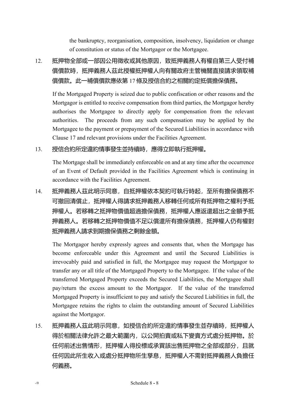 -/0 Schedule 8 - 8 the bankruptcy, reorganisation, composition, insolvency, liquidation or change of constitution or status of the Mortgagor or the Mortgagee. 12. 抵押物全部或一部因公用徵收或其他原因,致抵押義務人有權自第三人受付補 償價款時,抵押義務人茲此授權抵押權人向有關政府主管機關直接請求領取補 償價款。此一補償價款應依第 17條及授信合約之相關約定抵償擔保債務。 If the Mortgaged Property is seized due to public confiscation or other reasons and the Mortgagor is entitled to receive compensation from third parties, the Mortgagor hereby authorises the Mortgagee to directly apply for compensation from the relevant authorities. The proceeds from any such compensation may be applied by the Mortgagee to the payment or prepayment of the Secured Liabilities in accordance with Clause 17 and relevant provisions under the Facilities Agreement. 13. 授信合約所定違約情事發生並持續時,應得立即執行抵押權。 The Mortgage shall be immediately enforceable on and at any time after the occurrence of an Event of Default provided in the Facilities Agreement which is continuing in accordance with the Facilities Agreement. 14. 抵押義務人茲此明示同意,自抵押權依本契約可執行時起,至所有擔保債務不 可撤回清償止,抵押權人得請求抵押義務人移轉任何或所有抵押物之權利予抵 押權人。若移轉之抵押物價值超過擔保債務,抵押權人應返還超出之金額予抵 押義務人。若移轉之抵押物價值不足以償還所有擔保債務,抵押權人仍有權對 抵押義務人請求到期擔保債務之剩餘金額。 The Mortgagor hereby expressly agrees and consents that, when the Mortgage has become enforceable under this Agreement and until the Secured Liabilities is irrevocably paid and satisfied in full, the Mortgagee may request the Mortgagor to transfer any or all title of the Mortgaged Property to the Mortgagee. If the value of the transferred Mortgaged Property exceeds the Secured Liabilities, the Mortgagee shall pay/return the excess amount to the Mortgagor. If the value of the transferred Mortgaged Property is insufficient to pay and satisfy the Secured Liabilities in full, the Mortgagee retains the rights to claim the outstanding amount of Secured Liabilities against the Mortgagor. 15. 抵押義務人茲此明示同意,如授信合約所定違約情事發生並存續時,抵押權人 得於相關法律允許之最大範圍內,以公開拍賣或私下變賣方式處分抵押物。於 任何前述出售情形,抵押權人得投標或承買該出售抵押物之全部或部分,且就 任何因此所生收入或處分抵押物所生孳息,抵押權人不需對抵押義務人負擔任 何義務。