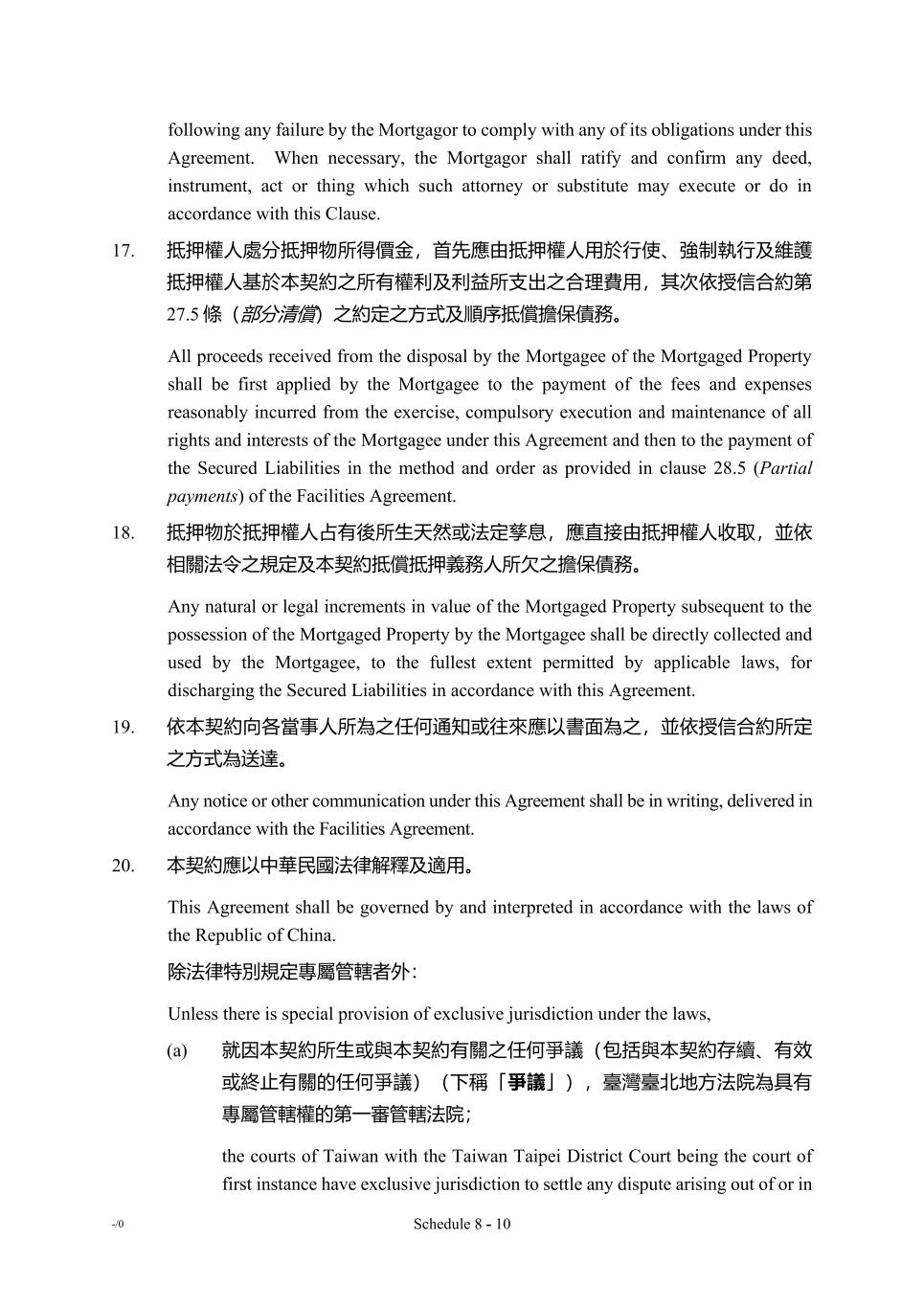 -/0 Schedule 8 - 10 following any failure by the Mortgagor to comply with any of its obligations under this Agreement. When necessary, the Mortgagor shall ratify and confirm any deed, instrument, act or thing which such attorney or substitute may execute or do in accordance with this Clause. 17. 抵押權人處分抵押物所得價金,首先應由抵押權人用於行使、強制執行及維護 抵押權人基於本契約之所有權利及利益所支出之合理費用,其次依授信合約第 27.5條(部分清償)之約定之方式及順序抵償擔保債務。 All proceeds received from the disposal by the Mortgagee of the Mortgaged Property shall be first applied by the Mortgagee to the payment of the fees and expenses reasonably incurred from the exercise, compulsory execution and maintenance of all rights and interests of the Mortgagee under this Agreement and then to the payment of the Secured Liabilities in the method and order as provided in clause 28.5 (Partial payments) of the Facilities Agreement. 18. 抵押物於抵押權人占有後所生天然或法定孳息,應直接由抵押權人收取,並依 相關法令之規定及本契約抵償抵押義務人所欠之擔保債務。 Any natural or legal increments in value of the Mortgaged Property subsequent to the possession of the Mortgaged Property by the Mortgagee shall be directly collected and used by the Mortgagee, to the fullest extent permitted by applicable laws, for discharging the Secured Liabilities in accordance with this Agreement. 19. 依本契約向各當事人所為之任何通知或往來應以書面為之,並依授信合約所定 之方式為送達。 Any notice or other communication under this Agreement shall be in writing, delivered in accordance with the Facilities Agreement. 20. 本契約應以中華民國法律解釋及適用。 This Agreement shall be governed by and interpreted in accordance with the laws of the Republic of China. 除法律特別規定專屬管轄者外: Unless there is special provision of exclusive jurisdiction under the laws, (a) 就因本契約所生或與本契約有關之任何爭議(包括與本契約存續、有效 或終止有關的任何爭議)(下稱「爭議」),臺灣臺北地方法院為具有 專屬管轄權的第一審管轄法院; the courts of Taiwan with the Taiwan Taipei District Court being the court of first instance have exclusive jurisdiction to settle any dispute arising out of or in
