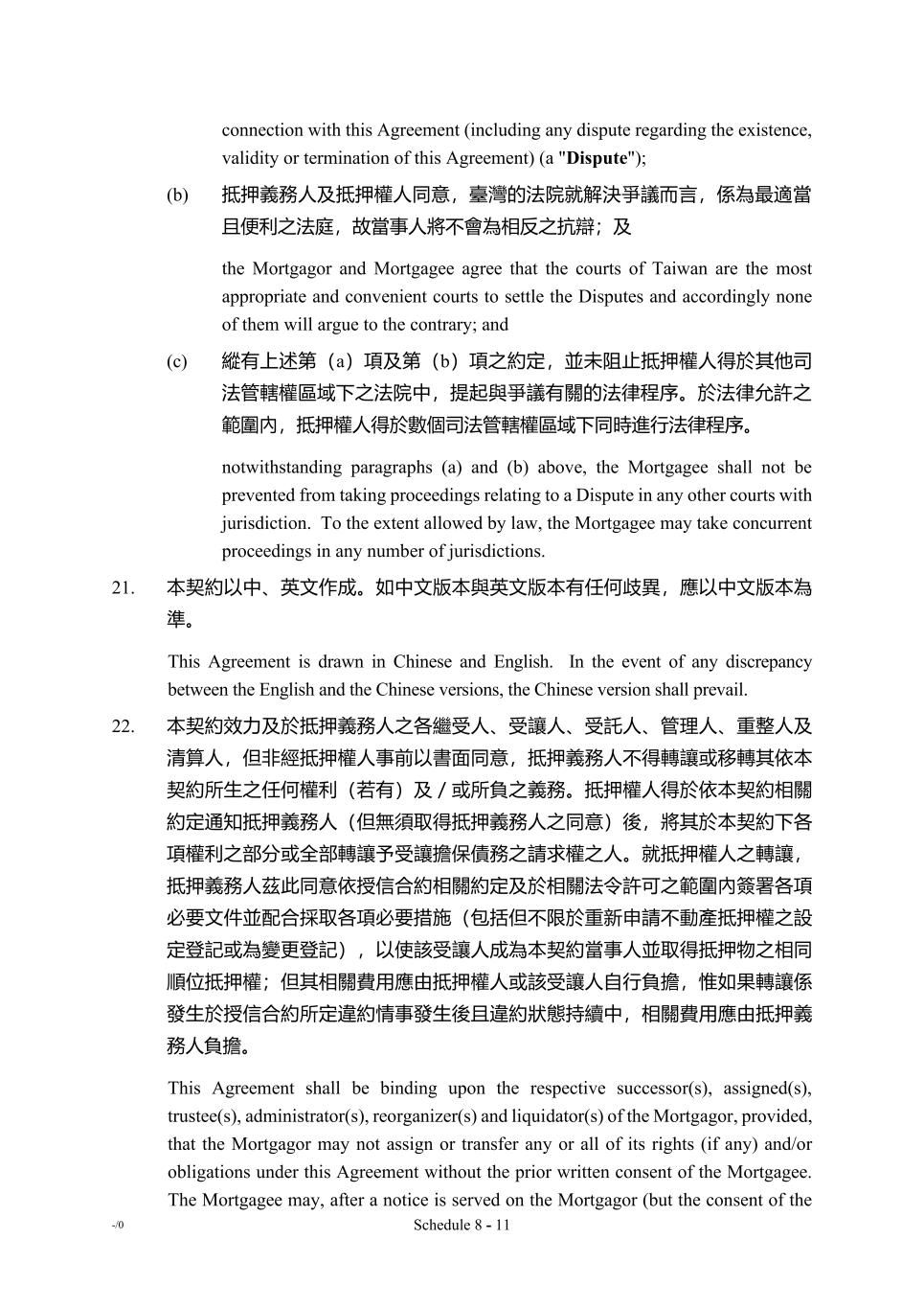 -/0 Schedule 8 - 11 connection with this Agreement (including any dispute regarding the existence, validity or termination of this Agreement) (a "Dispute"); (b) 抵押義務人及抵押權人同意,臺灣的法院就解決爭議而言,係為最適當 且便利之法庭,故當事人將不會為相反之抗辯;及 the Mortgagor and Mortgagee agree that the courts of Taiwan are the most appropriate and convenient courts to settle the Disputes and accordingly none of them will argue to the contrary; and (c) 縱有上述第(a)項及第(b)項之約定,並未阻止抵押權人得於其他司 法管轄權區域下之法院中,提起與爭議有關的法律程序。於法律允許之 範圍內,抵押權人得於數個司法管轄權區域下同時進行法律程序。 notwithstanding paragraphs (a) and (b) above, the Mortgagee shall not be prevented from taking proceedings relating to a Dispute in any other courts with jurisdiction. To the extent allowed by law, the Mortgagee may take concurrent proceedings in any number of jurisdictions. 21. 本契約以中、英文作成。如中文版本與英文版本有任何歧異,應以中文版本為 準。 This Agreement is drawn in Chinese and English. In the event of any discrepancy between the English and the Chinese versions, the Chinese version shall prevail. 22. 本契約效力及於抵押義務人之各繼受人、受讓人、受託人、管理人、重整人及 清算人,但非經抵押權人事前以書面同意,抵押義務人不得轉讓或移轉其依本 契約所生之任何權利(若有)及/或所負之義務。抵押權人得於依本契約相關 約定通知抵押義務人(但無須取得抵押義務人之同意)後,將其於本契約下各 項權利之部分或全部轉讓予受讓擔保債務之請求權之人。就抵押權人之轉讓, 抵押義務人茲此同意依授信合約相關約定及於相關法令許可之範圍內簽署各項 必要文件並配合採取各項必要措施(包括但不限於重新申請不動產抵押權之設 定登記或為變更登記),以使該受讓人成為本契約當事人並取得抵押物之相同 順位抵押權;但其相關費用應由抵押權人或該受讓人自行負擔,惟如果轉讓係 發生於授信合約所定違約情事發生後且違約狀態持續中,相關費用應由抵押義 務人負擔。 This Agreement shall be binding upon the respective successor(s), assigned(s), trustee(s), administrator(s), reorganizer(s) and liquidator(s) of the Mortgagor, provided, that the Mortgagor may not assign or transfer any or all of its rights (if any) and/or obligations under this Agreement without the prior written consent of the Mortgagee. The Mortgagee may, after a notice is served on the Mortgagor (but the consent of the