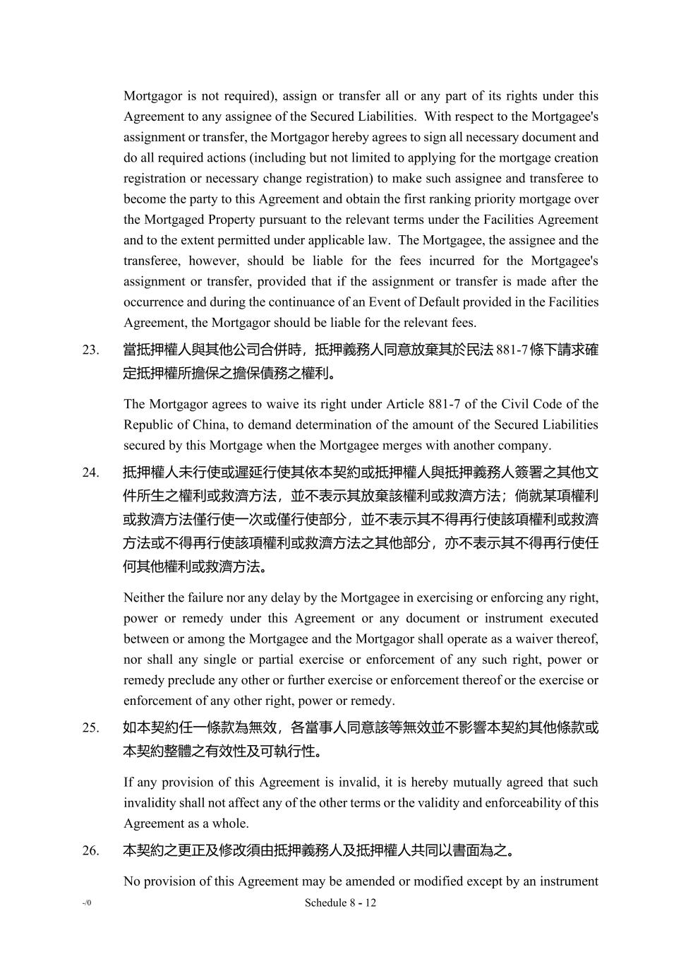 -/0 Schedule 8 - 12 Mortgagor is not required), assign or transfer all or any part of its rights under this Agreement to any assignee of the Secured Liabilities. With respect to the Mortgagee's assignment or transfer, the Mortgagor hereby agrees to sign all necessary document and do all required actions (including but not limited to applying for the mortgage creation registration or necessary change registration) to make such assignee and transferee to become the party to this Agreement and obtain the first ranking priority mortgage over the Mortgaged Property pursuant to the relevant terms under the Facilities Agreement and to the extent permitted under applicable law. The Mortgagee, the assignee and the transferee, however, should be liable for the fees incurred for the Mortgagee's assignment or transfer, provided that if the assignment or transfer is made after the occurrence and during the continuance of an Event of Default provided in the Facilities Agreement, the Mortgagor should be liable for the relevant fees. 23. 當抵押權人與其他公司合併時,抵押義務人同意放棄其於民法 881-7條下請求確 定抵押權所擔保之擔保債務之權利。 The Mortgagor agrees to waive its right under Article 881-7 of the Civil Code of the Republic of China, to demand determination of the amount of the Secured Liabilities secured by this Mortgage when the Mortgagee merges with another company. 24. 抵押權人未行使或遲延行使其依本契約或抵押權人與抵押義務人簽署之其他文 件所生之權利或救濟方法,並不表示其放棄該權利或救濟方法;倘就某項權利 或救濟方法僅行使一次或僅行使部分,並不表示其不得再行使該項權利或救濟 方法或不得再行使該項權利或救濟方法之其他部分,亦不表示其不得再行使任 何其他權利或救濟方法。 Neither the failure nor any delay by the Mortgagee in exercising or enforcing any right, power or remedy under this Agreement or any document or instrument executed between or among the Mortgagee and the Mortgagor shall operate as a waiver thereof, nor shall any single or partial exercise or enforcement of any such right, power or remedy preclude any other or further exercise or enforcement thereof or the exercise or enforcement of any other right, power or remedy. 25. 如本契約任一條款為無效,各當事人同意該等無效並不影響本契約其他條款或 本契約整體之有效性及可執行性。 If any provision of this Agreement is invalid, it is hereby mutually agreed that such invalidity shall not affect any of the other terms or the validity and enforceability of this Agreement as a whole. 26. 本契約之更正及修改須由抵押義務人及抵押權人共同以書面為之。 No provision of this Agreement may be amended or modified except by an instrument