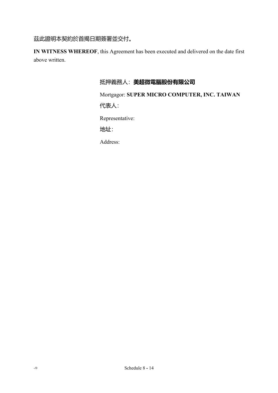 -/0 Schedule 8 - 14 茲此證明本契約於首揭日期簽署並交付。 IN WITNESS WHEREOF, this Agreement has been executed and delivered on the date first above written. 抵押義務人:美超微電腦股份有限公司 Mortgagor: SUPER MICRO COMPUTER, INC. TAIWAN 代表人: Representative: 地址: Address: