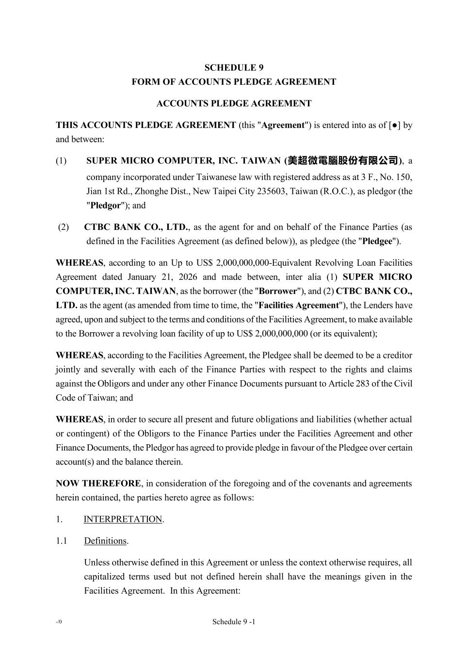 -/0 Schedule 9 -1 SCHEDULE 9 FORM OF ACCOUNTS PLEDGE AGREEMENT ACCOUNTS PLEDGE AGREEMENT THIS ACCOUNTS PLEDGE AGREEMENT (this "Agreement") is entered into as of [●] by and between: (1) SUPER MICRO COMPUTER, INC. TAIWAN (美超微電腦股份有限公司), a company incorporated under Taiwanese law with registered address as at 3 F., No. 150, Jian 1st Rd., Zhonghe Dist., New Taipei City 235603, Taiwan (R.O.C.), as pledgor (the "Pledgor"); and (2) CTBC BANK CO., LTD., as the agent for and on behalf of the Finance Parties (as defined in the Facilities Agreement (as defined below)), as pledgee (the "Pledgee"). WHEREAS, according to an Up to US$ 2,000,000,000-Equivalent Revolving Loan Facilities Agreement dated January 21, 2026 and made between, inter alia (1) SUPER MICRO COMPUTER, INC. TAIWAN, as the borrower (the "Borrower"), and (2) CTBC BANK CO., LTD. as the agent (as amended from time to time, the "Facilities Agreement"), the Lenders have agreed, upon and subject to the terms and conditions of the Facilities Agreement, to make available to the Borrower a revolving loan facility of up to US$ 2,000,000,000 (or its equivalent); WHEREAS, according to the Facilities Agreement, the Pledgee shall be deemed to be a creditor jointly and severally with each of the Finance Parties with respect to the rights and claims against the Obligors and under any other Finance Documents pursuant to Article 283 of the Civil Code of Taiwan; and WHEREAS, in order to secure all present and future obligations and liabilities (whether actual or contingent) of the Obligors to the Finance Parties under the Facilities Agreement and other Finance Documents, the Pledgor has agreed to provide pledge in favour of the Pledgee over certain account(s) and the balance therein. NOW THEREFORE, in consideration of the foregoing and of the covenants and agreements herein contained, the parties hereto agree as follows: 1. INTERPRETATION. 1.1 Definitions. Unless otherwise defined in this Agreement or unless the context otherwise requires, all capitalized terms used but not defined herein shall have the meanings given in the Facilities Agreement. In this Agreement: