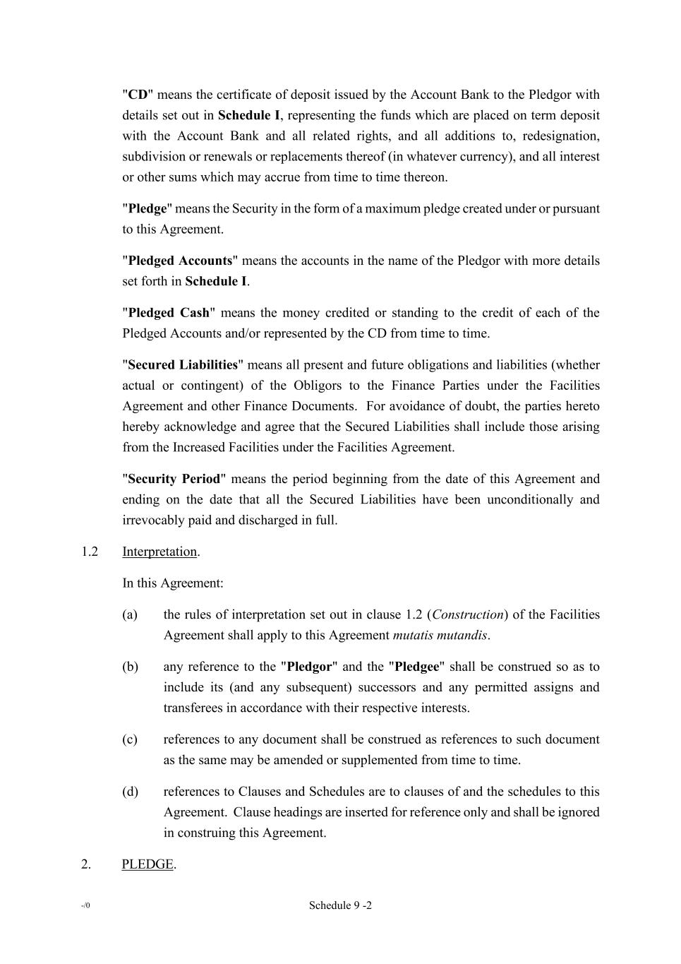 -/0 Schedule 9 -2 "CD" means the certificate of deposit issued by the Account Bank to the Pledgor with details set out in Schedule I, representing the funds which are placed on term deposit with the Account Bank and all related rights, and all additions to, redesignation, subdivision or renewals or replacements thereof (in whatever currency), and all interest or other sums which may accrue from time to time thereon. "Pledge" means the Security in the form of a maximum pledge created under or pursuant to this Agreement. "Pledged Accounts" means the accounts in the name of the Pledgor with more details set forth in Schedule I. "Pledged Cash" means the money credited or standing to the credit of each of the Pledged Accounts and/or represented by the CD from time to time. "Secured Liabilities" means all present and future obligations and liabilities (whether actual or contingent) of the Obligors to the Finance Parties under the Facilities Agreement and other Finance Documents. For avoidance of doubt, the parties hereto hereby acknowledge and agree that the Secured Liabilities shall include those arising from the Increased Facilities under the Facilities Agreement. "Security Period" means the period beginning from the date of this Agreement and ending on the date that all the Secured Liabilities have been unconditionally and irrevocably paid and discharged in full. 1.2 Interpretation. In this Agreement: (a) the rules of interpretation set out in clause 1.2 (Construction) of the Facilities Agreement shall apply to this Agreement mutatis mutandis. (b) any reference to the "Pledgor" and the "Pledgee" shall be construed so as to include its (and any subsequent) successors and any permitted assigns and transferees in accordance with their respective interests. (c) references to any document shall be construed as references to such document as the same may be amended or supplemented from time to time. (d) references to Clauses and Schedules are to clauses of and the schedules to this Agreement. Clause headings are inserted for reference only and shall be ignored in construing this Agreement. 2. PLEDGE.