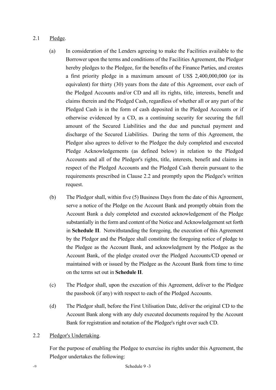 -/0 Schedule 9 -3 2.1 Pledge. (a) In consideration of the Lenders agreeing to make the Facilities available to the Borrower upon the terms and conditions of the Facilities Agreement, the Pledgor hereby pledges to the Pledgee, for the benefits of the Finance Parties, and creates a first priority pledge in a maximum amount of US$ 2,400,000,000 (or its equivalent) for thirty (30) years from the date of this Agreement, over each of the Pledged Accounts and/or CD and all its rights, title, interests, benefit and claims therein and the Pledged Cash, regardless of whether all or any part of the Pledged Cash is in the form of cash deposited in the Pledged Accounts or if otherwise evidenced by a CD, as a continuing security for securing the full amount of the Secured Liabilities and the due and punctual payment and discharge of the Secured Liabilities. During the term of this Agreement, the Pledgor also agrees to deliver to the Pledgee the duly completed and executed Pledge Acknowledgements (as defined below) in relation to the Pledged Accounts and all of the Pledgor's rights, title, interests, benefit and claims in respect of the Pledged Accounts and the Pledged Cash therein pursuant to the requirements prescribed in Clause 2.2 and promptly upon the Pledgee's written request. (b) The Pledgor shall, within five (5) Business Days from the date of this Agreement, serve a notice of the Pledge on the Account Bank and promptly obtain from the Account Bank a duly completed and executed acknowledgement of the Pledge substantially in the form and content of the Notice and Acknowledgement set forth in Schedule II. Notwithstanding the foregoing, the execution of this Agreement by the Pledgor and the Pledgee shall constitute the foregoing notice of pledge to the Pledgee as the Account Bank, and acknowledgment by the Pledgee as the Account Bank, of the pledge created over the Pledged Accounts/CD opened or maintained with or issued by the Pledgee as the Account Bank from time to time on the terms set out in Schedule II. (c) The Pledgor shall, upon the execution of this Agreement, deliver to the Pledgee the passbook (if any) with respect to each of the Pledged Accounts. (d) The Pledgor shall, before the First Utilisation Date, deliver the original CD to the Account Bank along with any duly executed documents required by the Account Bank for registration and notation of the Pledgee's right over such CD. 2.2 Pledgor's Undertaking. For the purpose of enabling the Pledgee to exercise its rights under this Agreement, the Pledgor undertakes the following: