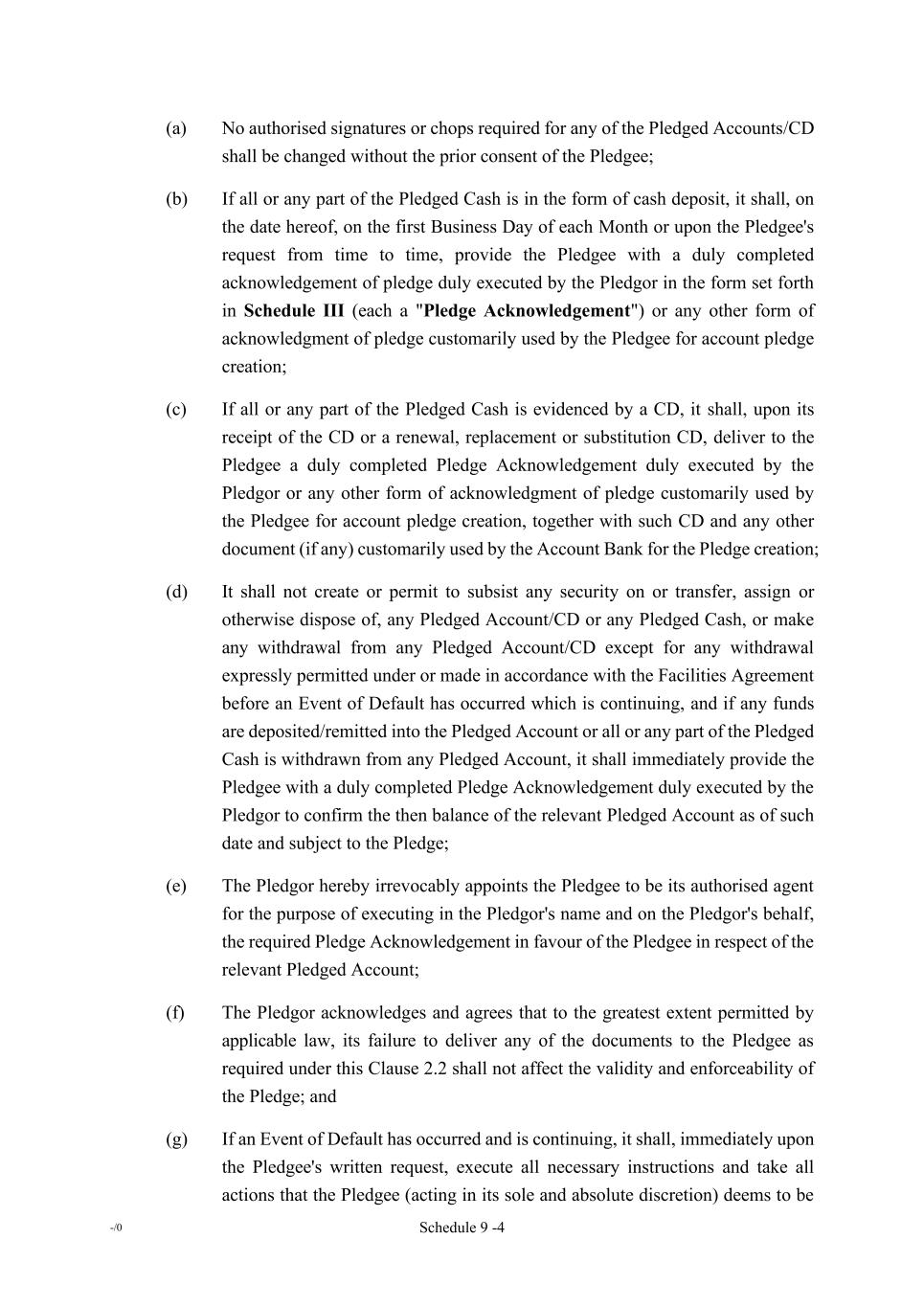 -/0 Schedule 9 -4 (a) No authorised signatures or chops required for any of the Pledged Accounts/CD shall be changed without the prior consent of the Pledgee; (b) If all or any part of the Pledged Cash is in the form of cash deposit, it shall, on the date hereof, on the first Business Day of each Month or upon the Pledgee's request from time to time, provide the Pledgee with a duly completed acknowledgement of pledge duly executed by the Pledgor in the form set forth in Schedule III (each a "Pledge Acknowledgement") or any other form of acknowledgment of pledge customarily used by the Pledgee for account pledge creation; (c) If all or any part of the Pledged Cash is evidenced by a CD, it shall, upon its receipt of the CD or a renewal, replacement or substitution CD, deliver to the Pledgee a duly completed Pledge Acknowledgement duly executed by the Pledgor or any other form of acknowledgment of pledge customarily used by the Pledgee for account pledge creation, together with such CD and any other document (if any) customarily used by the Account Bank for the Pledge creation; (d) It shall not create or permit to subsist any security on or transfer, assign or otherwise dispose of, any Pledged Account/CD or any Pledged Cash, or make any withdrawal from any Pledged Account/CD except for any withdrawal expressly permitted under or made in accordance with the Facilities Agreement before an Event of Default has occurred which is continuing, and if any funds are deposited/remitted into the Pledged Account or all or any part of the Pledged Cash is withdrawn from any Pledged Account, it shall immediately provide the Pledgee with a duly completed Pledge Acknowledgement duly executed by the Pledgor to confirm the then balance of the relevant Pledged Account as of such date and subject to the Pledge; (e) The Pledgor hereby irrevocably appoints the Pledgee to be its authorised agent for the purpose of executing in the Pledgor's name and on the Pledgor's behalf, the required Pledge Acknowledgement in favour of the Pledgee in respect of the relevant Pledged Account; (f) The Pledgor acknowledges and agrees that to the greatest extent permitted by applicable law, its failure to deliver any of the documents to the Pledgee as required under this Clause 2.2 shall not affect the validity and enforceability of the Pledge; and (g) If an Event of Default has occurred and is continuing, it shall, immediately upon the Pledgee's written request, execute all necessary instructions and take all actions that the Pledgee (acting in its sole and absolute discretion) deems to be