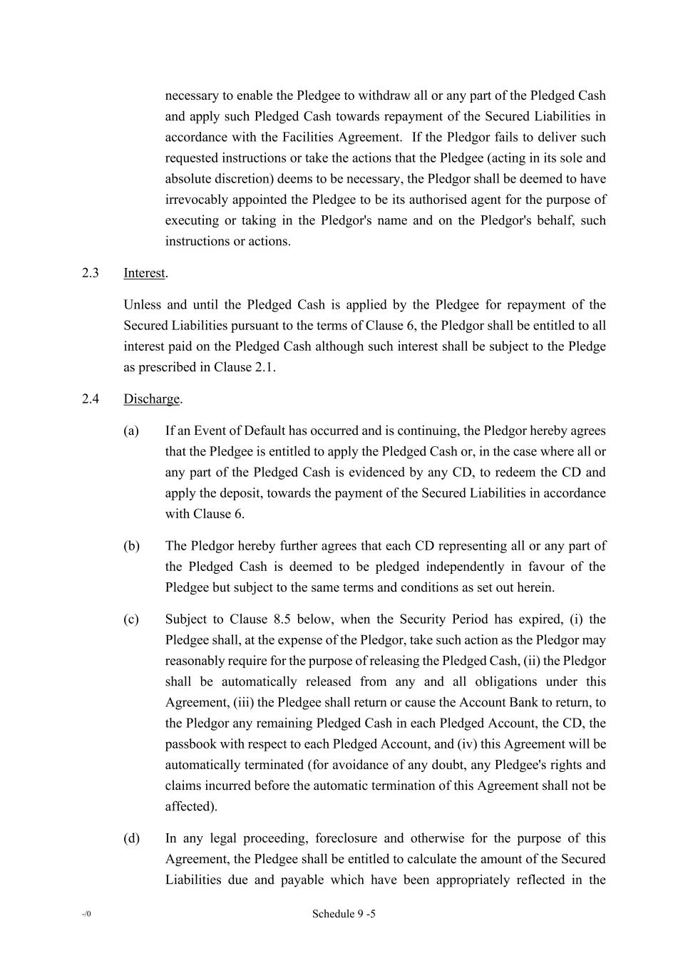 -/0 Schedule 9 -5 necessary to enable the Pledgee to withdraw all or any part of the Pledged Cash and apply such Pledged Cash towards repayment of the Secured Liabilities in accordance with the Facilities Agreement. If the Pledgor fails to deliver such requested instructions or take the actions that the Pledgee (acting in its sole and absolute discretion) deems to be necessary, the Pledgor shall be deemed to have irrevocably appointed the Pledgee to be its authorised agent for the purpose of executing or taking in the Pledgor's name and on the Pledgor's behalf, such instructions or actions. 2.3 Interest. Unless and until the Pledged Cash is applied by the Pledgee for repayment of the Secured Liabilities pursuant to the terms of Clause 6, the Pledgor shall be entitled to all interest paid on the Pledged Cash although such interest shall be subject to the Pledge as prescribed in Clause 2.1. 2.4 Discharge. (a) If an Event of Default has occurred and is continuing, the Pledgor hereby agrees that the Pledgee is entitled to apply the Pledged Cash or, in the case where all or any part of the Pledged Cash is evidenced by any CD, to redeem the CD and apply the deposit, towards the payment of the Secured Liabilities in accordance with Clause 6. (b) The Pledgor hereby further agrees that each CD representing all or any part of the Pledged Cash is deemed to be pledged independently in favour of the Pledgee but subject to the same terms and conditions as set out herein. (c) Subject to Clause 8.5 below, when the Security Period has expired, (i) the Pledgee shall, at the expense of the Pledgor, take such action as the Pledgor may reasonably require for the purpose of releasing the Pledged Cash, (ii) the Pledgor shall be automatically released from any and all obligations under this Agreement, (iii) the Pledgee shall return or cause the Account Bank to return, to the Pledgor any remaining Pledged Cash in each Pledged Account, the CD, the passbook with respect to each Pledged Account, and (iv) this Agreement will be automatically terminated (for avoidance of any doubt, any Pledgee's rights and claims incurred before the automatic termination of this Agreement shall not be affected). (d) In any legal proceeding, foreclosure and otherwise for the purpose of this Agreement, the Pledgee shall be entitled to calculate the amount of the Secured Liabilities due and payable which have been appropriately reflected in the
