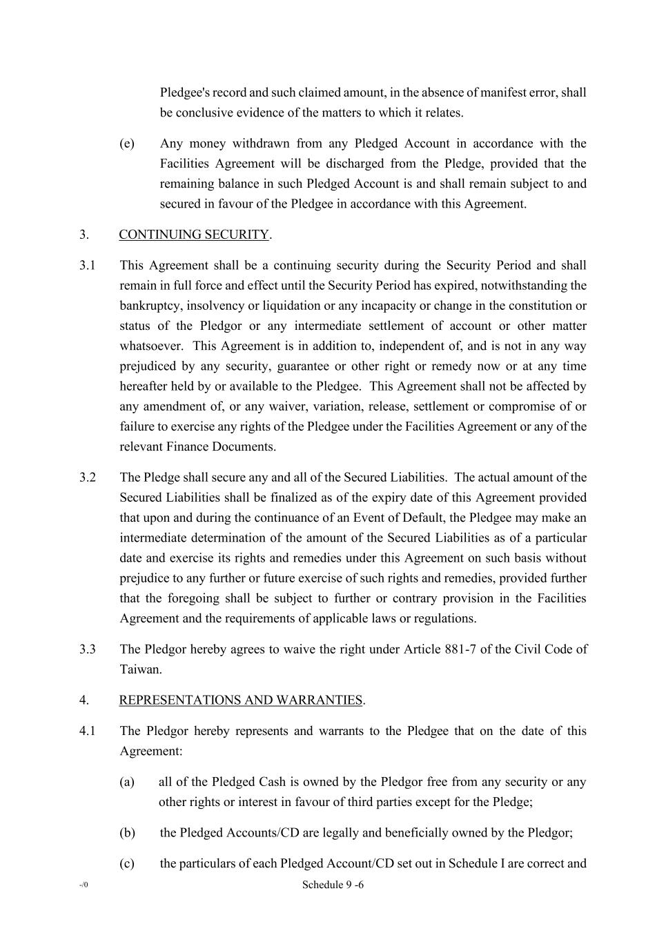 -/0 Schedule 9 -6 Pledgee's record and such claimed amount, in the absence of manifest error, shall be conclusive evidence of the matters to which it relates. (e) Any money withdrawn from any Pledged Account in accordance with the Facilities Agreement will be discharged from the Pledge, provided that the remaining balance in such Pledged Account is and shall remain subject to and secured in favour of the Pledgee in accordance with this Agreement. 3. CONTINUING SECURITY. 3.1 This Agreement shall be a continuing security during the Security Period and shall remain in full force and effect until the Security Period has expired, notwithstanding the bankruptcy, insolvency or liquidation or any incapacity or change in the constitution or status of the Pledgor or any intermediate settlement of account or other matter whatsoever. This Agreement is in addition to, independent of, and is not in any way prejudiced by any security, guarantee or other right or remedy now or at any time hereafter held by or available to the Pledgee. This Agreement shall not be affected by any amendment of, or any waiver, variation, release, settlement or compromise of or failure to exercise any rights of the Pledgee under the Facilities Agreement or any of the relevant Finance Documents. 3.2 The Pledge shall secure any and all of the Secured Liabilities. The actual amount of the Secured Liabilities shall be finalized as of the expiry date of this Agreement provided that upon and during the continuance of an Event of Default, the Pledgee may make an intermediate determination of the amount of the Secured Liabilities as of a particular date and exercise its rights and remedies under this Agreement on such basis without prejudice to any further or future exercise of such rights and remedies, provided further that the foregoing shall be subject to further or contrary provision in the Facilities Agreement and the requirements of applicable laws or regulations. 3.3 The Pledgor hereby agrees to waive the right under Article 881-7 of the Civil Code of Taiwan. 4. REPRESENTATIONS AND WARRANTIES. 4.1 The Pledgor hereby represents and warrants to the Pledgee that on the date of this Agreement: (a) all of the Pledged Cash is owned by the Pledgor free from any security or any other rights or interest in favour of third parties except for the Pledge; (b) the Pledged Accounts/CD are legally and beneficially owned by the Pledgor; (c) the particulars of each Pledged Account/CD set out in Schedule I are correct and