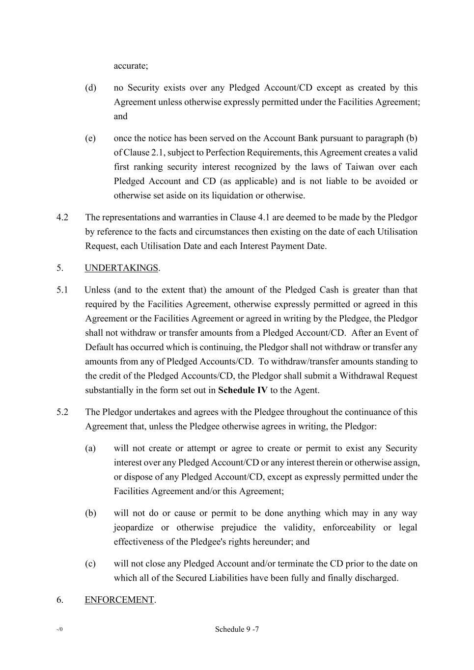 -/0 Schedule 9 -7 accurate; (d) no Security exists over any Pledged Account/CD except as created by this Agreement unless otherwise expressly permitted under the Facilities Agreement; and (e) once the notice has been served on the Account Bank pursuant to paragraph (b) of Clause 2.1, subject to Perfection Requirements, this Agreement creates a valid first ranking security interest recognized by the laws of Taiwan over each Pledged Account and CD (as applicable) and is not liable to be avoided or otherwise set aside on its liquidation or otherwise. 4.2 The representations and warranties in Clause 4.1 are deemed to be made by the Pledgor by reference to the facts and circumstances then existing on the date of each Utilisation Request, each Utilisation Date and each Interest Payment Date. 5. UNDERTAKINGS. 5.1 Unless (and to the extent that) the amount of the Pledged Cash is greater than that required by the Facilities Agreement, otherwise expressly permitted or agreed in this Agreement or the Facilities Agreement or agreed in writing by the Pledgee, the Pledgor shall not withdraw or transfer amounts from a Pledged Account/CD. After an Event of Default has occurred which is continuing, the Pledgor shall not withdraw or transfer any amounts from any of Pledged Accounts/CD. To withdraw/transfer amounts standing to the credit of the Pledged Accounts/CD, the Pledgor shall submit a Withdrawal Request substantially in the form set out in Schedule IV to the Agent. 5.2 The Pledgor undertakes and agrees with the Pledgee throughout the continuance of this Agreement that, unless the Pledgee otherwise agrees in writing, the Pledgor: (a) will not create or attempt or agree to create or permit to exist any Security interest over any Pledged Account/CD or any interest therein or otherwise assign, or dispose of any Pledged Account/CD, except as expressly permitted under the Facilities Agreement and/or this Agreement; (b) will not do or cause or permit to be done anything which may in any way jeopardize or otherwise prejudice the validity, enforceability or legal effectiveness of the Pledgee's rights hereunder; and (c) will not close any Pledged Account and/or terminate the CD prior to the date on which all of the Secured Liabilities have been fully and finally discharged. 6. ENFORCEMENT.