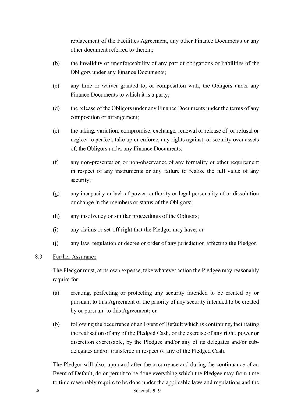 -/0 Schedule 9 -9 replacement of the Facilities Agreement, any other Finance Documents or any other document referred to therein; (b) the invalidity or unenforceability of any part of obligations or liabilities of the Obligors under any Finance Documents; (c) any time or waiver granted to, or composition with, the Obligors under any Finance Documents to which it is a party; (d) the release of the Obligors under any Finance Documents under the terms of any composition or arrangement; (e) the taking, variation, compromise, exchange, renewal or release of, or refusal or neglect to perfect, take up or enforce, any rights against, or security over assets of, the Obligors under any Finance Documents; (f) any non-presentation or non-observance of any formality or other requirement in respect of any instruments or any failure to realise the full value of any security; (g) any incapacity or lack of power, authority or legal personality of or dissolution or change in the members or status of the Obligors; (h) any insolvency or similar proceedings of the Obligors; (i) any claims or set-off right that the Pledgor may have; or (j) any law, regulation or decree or order of any jurisdiction affecting the Pledgor. 8.3 Further Assurance. The Pledgor must, at its own expense, take whatever action the Pledgee may reasonably require for: (a) creating, perfecting or protecting any security intended to be created by or pursuant to this Agreement or the priority of any security intended to be created by or pursuant to this Agreement; or (b) following the occurrence of an Event of Default which is continuing, facilitating the realisation of any of the Pledged Cash, or the exercise of any right, power or discretion exercisable, by the Pledgee and/or any of its delegates and/or sub- delegates and/or transferee in respect of any of the Pledged Cash. The Pledgor will also, upon and after the occurrence and during the continuance of an Event of Default, do or permit to be done everything which the Pledgee may from time to time reasonably require to be done under the applicable laws and regulations and the