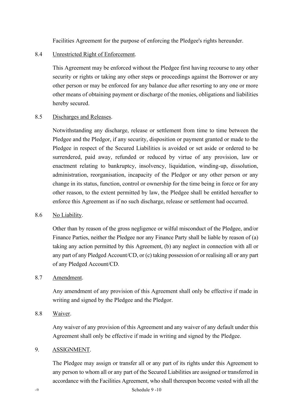 -/0 Schedule 9 -10 Facilities Agreement for the purpose of enforcing the Pledgee's rights hereunder. 8.4 Unrestricted Right of Enforcement. This Agreement may be enforced without the Pledgee first having recourse to any other security or rights or taking any other steps or proceedings against the Borrower or any other person or may be enforced for any balance due after resorting to any one or more other means of obtaining payment or discharge of the monies, obligations and liabilities hereby secured. 8.5 Discharges and Releases. Notwithstanding any discharge, release or settlement from time to time between the Pledgee and the Pledgor, if any security, disposition or payment granted or made to the Pledgee in respect of the Secured Liabilities is avoided or set aside or ordered to be surrendered, paid away, refunded or reduced by virtue of any provision, law or enactment relating to bankruptcy, insolvency, liquidation, winding-up, dissolution, administration, reorganisation, incapacity of the Pledgor or any other person or any change in its status, function, control or ownership for the time being in force or for any other reason, to the extent permitted by law, the Pledgee shall be entitled hereafter to enforce this Agreement as if no such discharge, release or settlement had occurred. 8.6 No Liability. Other than by reason of the gross negligence or wilful misconduct of the Pledgee, and/or Finance Parties, neither the Pledgee nor any Finance Party shall be liable by reason of (a) taking any action permitted by this Agreement, (b) any neglect in connection with all or any part of any Pledged Account/CD, or (c) taking possession of or realising all or any part of any Pledged Account/CD. 8.7 Amendment. Any amendment of any provision of this Agreement shall only be effective if made in writing and signed by the Pledgee and the Pledgor. 8.8 Waiver. Any waiver of any provision of this Agreement and any waiver of any default under this Agreement shall only be effective if made in writing and signed by the Pledgee. 9. ASSIGNMENT. The Pledgee may assign or transfer all or any part of its rights under this Agreement to any person to whom all or any part of the Secured Liabilities are assigned or transferred in accordance with the Facilities Agreement, who shall thereupon become vested with all the