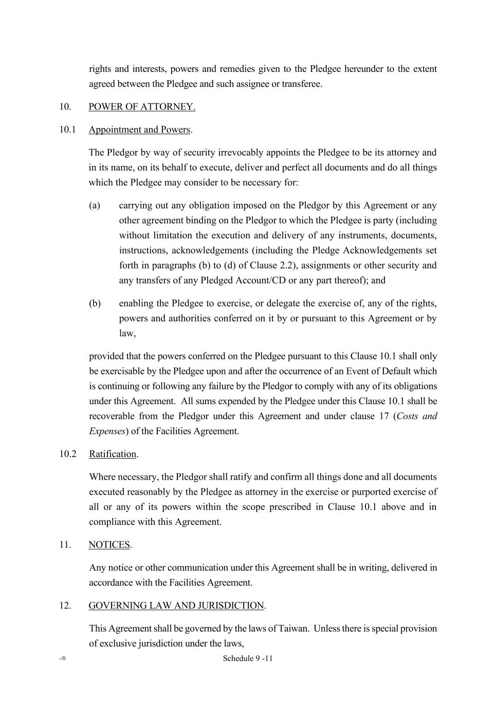 -/0 Schedule 9 -11 rights and interests, powers and remedies given to the Pledgee hereunder to the extent agreed between the Pledgee and such assignee or transferee. 10. POWER OF ATTORNEY. 10.1 Appointment and Powers. The Pledgor by way of security irrevocably appoints the Pledgee to be its attorney and in its name, on its behalf to execute, deliver and perfect all documents and do all things which the Pledgee may consider to be necessary for: (a) carrying out any obligation imposed on the Pledgor by this Agreement or any other agreement binding on the Pledgor to which the Pledgee is party (including without limitation the execution and delivery of any instruments, documents, instructions, acknowledgements (including the Pledge Acknowledgements set forth in paragraphs (b) to (d) of Clause 2.2), assignments or other security and any transfers of any Pledged Account/CD or any part thereof); and (b) enabling the Pledgee to exercise, or delegate the exercise of, any of the rights, powers and authorities conferred on it by or pursuant to this Agreement or by law, provided that the powers conferred on the Pledgee pursuant to this Clause 10.1 shall only be exercisable by the Pledgee upon and after the occurrence of an Event of Default which is continuing or following any failure by the Pledgor to comply with any of its obligations under this Agreement. All sums expended by the Pledgee under this Clause 10.1 shall be recoverable from the Pledgor under this Agreement and under clause 17 (Costs and Expenses) of the Facilities Agreement. 10.2 Ratification. Where necessary, the Pledgor shall ratify and confirm all things done and all documents executed reasonably by the Pledgee as attorney in the exercise or purported exercise of all or any of its powers within the scope prescribed in Clause 10.1 above and in compliance with this Agreement. 11. NOTICES. Any notice or other communication under this Agreement shall be in writing, delivered in accordance with the Facilities Agreement. 12. GOVERNING LAW AND JURISDICTION. This Agreement shall be governed by the laws of Taiwan. Unless there is special provision of exclusive jurisdiction under the laws,