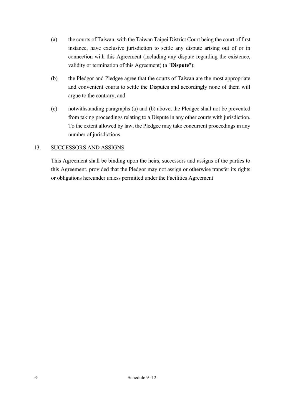 -/0 Schedule 9 -12 (a) the courts of Taiwan, with the Taiwan Taipei District Court being the court of first instance, have exclusive jurisdiction to settle any dispute arising out of or in connection with this Agreement (including any dispute regarding the existence, validity or termination of this Agreement) (a "Dispute"); (b) the Pledgor and Pledgee agree that the courts of Taiwan are the most appropriate and convenient courts to settle the Disputes and accordingly none of them will argue to the contrary; and (c) notwithstanding paragraphs (a) and (b) above, the Pledgee shall not be prevented from taking proceedings relating to a Dispute in any other courts with jurisdiction. To the extent allowed by law, the Pledgee may take concurrent proceedings in any number of jurisdictions. 13. SUCCESSORS AND ASSIGNS. This Agreement shall be binding upon the heirs, successors and assigns of the parties to this Agreement, provided that the Pledgor may not assign or otherwise transfer its rights or obligations hereunder unless permitted under the Facilities Agreement.