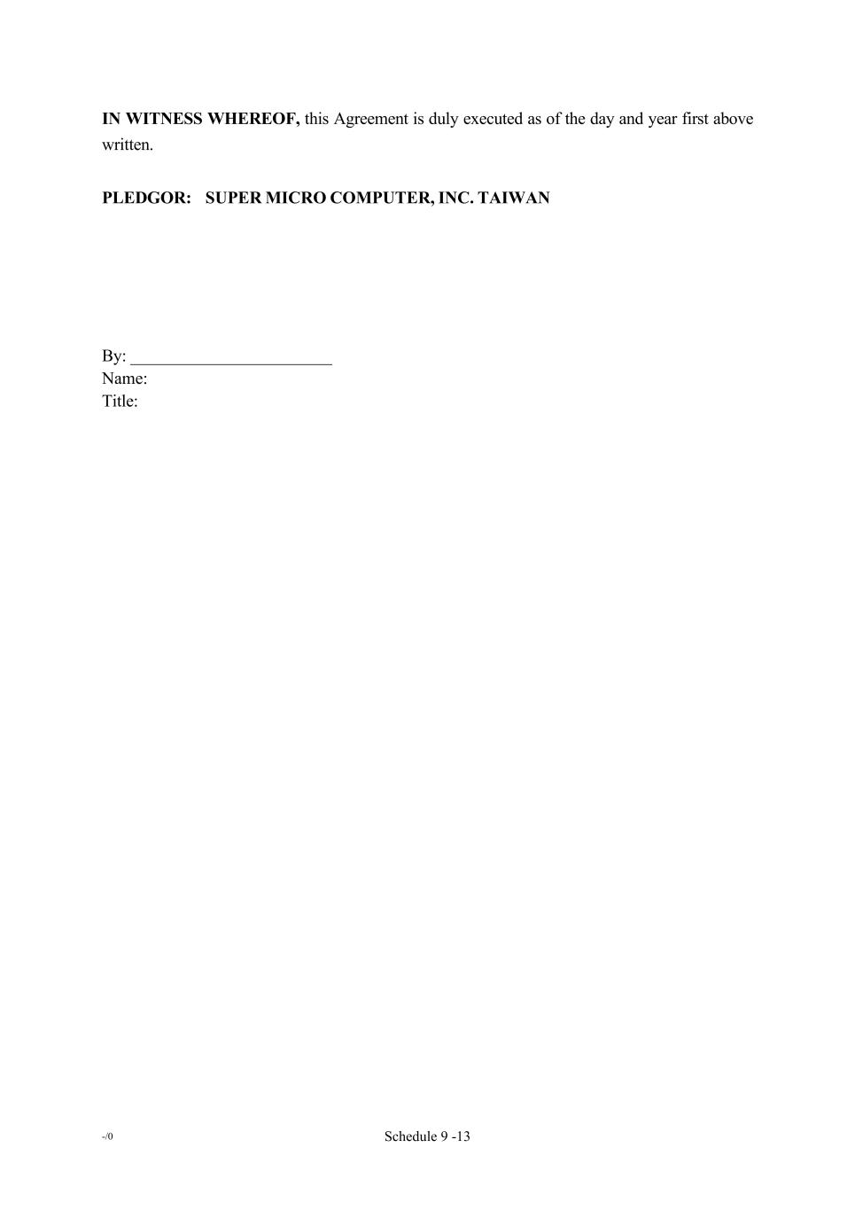 -/0 Schedule 9 -13 IN WITNESS WHEREOF, this Agreement is duly executed as of the day and year first above written. PLEDGOR: SUPER MICRO COMPUTER, INC. TAIWAN By: ________________________ Name: Title: