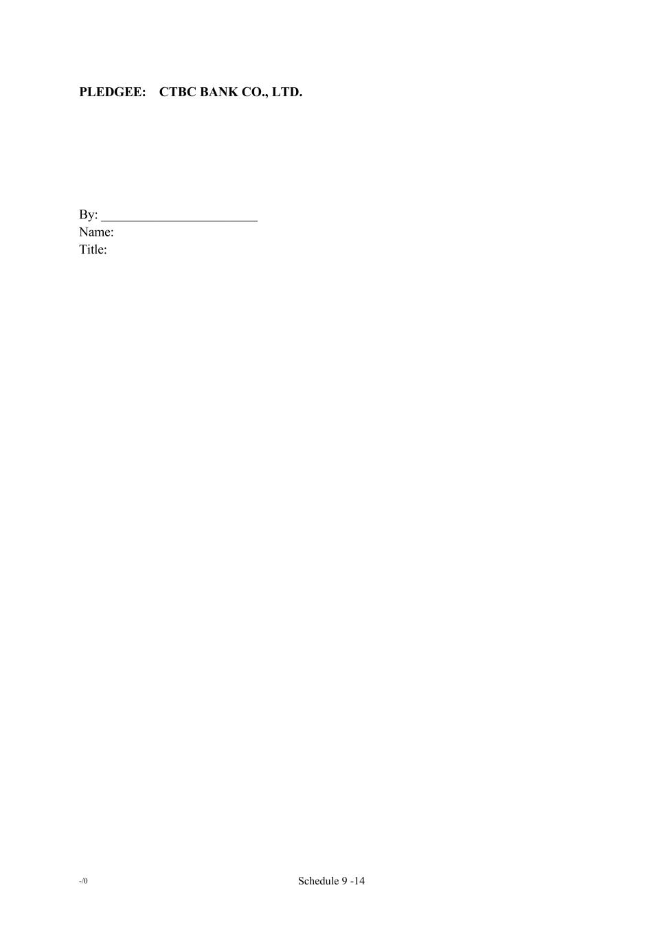 -/0 Schedule 9 -14 PLEDGEE: CTBC BANK CO., LTD. By: ________________________ Name: Title: