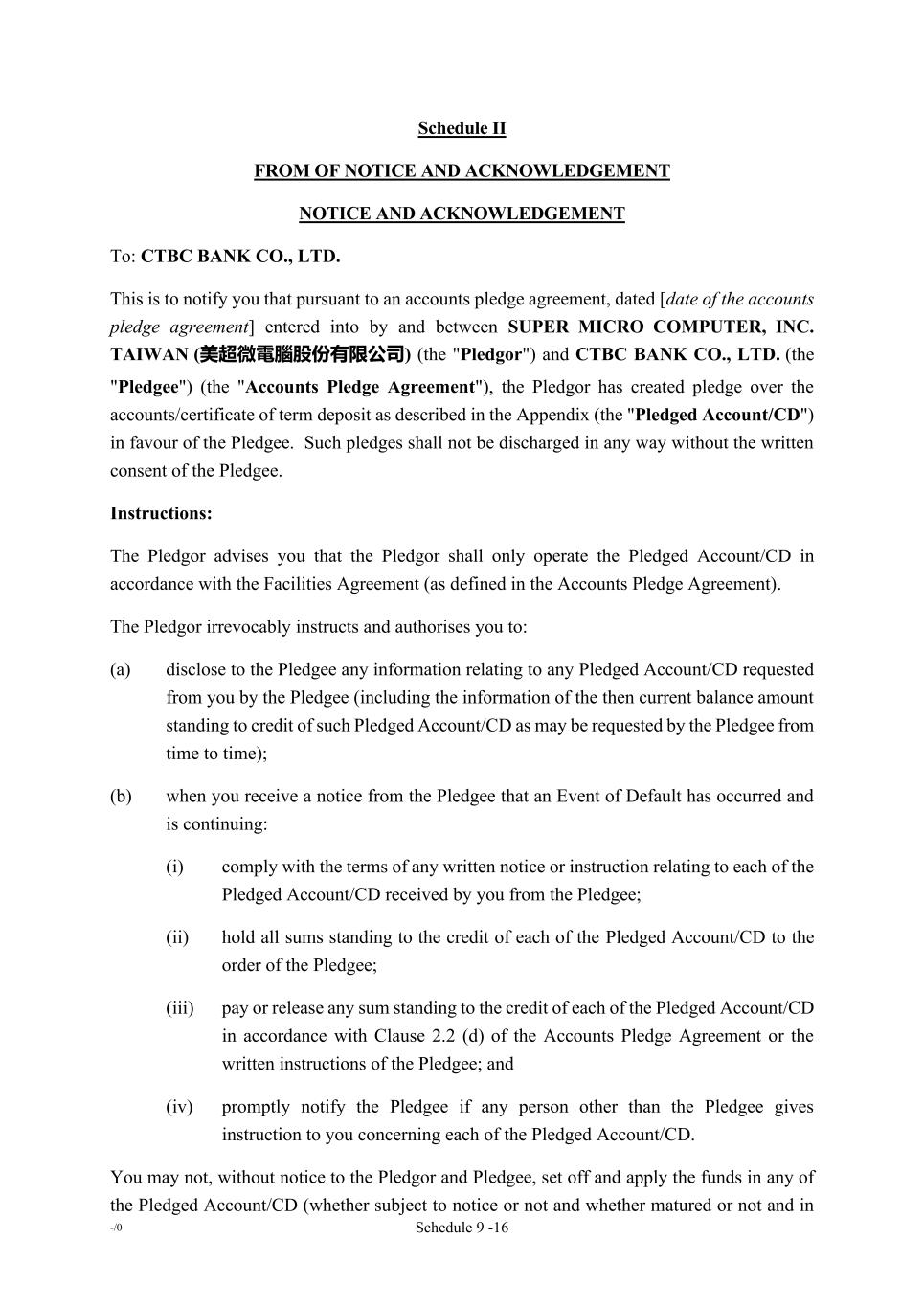 -/0 Schedule 9 -16 Schedule II FROM OF NOTICE AND ACKNOWLEDGEMENT NOTICE AND ACKNOWLEDGEMENT To: CTBC BANK CO., LTD. This is to notify you that pursuant to an accounts pledge agreement, dated [date of the accounts pledge agreement] entered into by and between SUPER MICRO COMPUTER, INC. TAIWAN (美超微電腦股份有限公司) (the "Pledgor") and CTBC BANK CO., LTD. (the "Pledgee") (the "Accounts Pledge Agreement"), the Pledgor has created pledge over the accounts/certificate of term deposit as described in the Appendix (the "Pledged Account/CD") in favour of the Pledgee. Such pledges shall not be discharged in any way without the written consent of the Pledgee. Instructions: The Pledgor advises you that the Pledgor shall only operate the Pledged Account/CD in accordance with the Facilities Agreement (as defined in the Accounts Pledge Agreement). The Pledgor irrevocably instructs and authorises you to: (a) disclose to the Pledgee any information relating to any Pledged Account/CD requested from you by the Pledgee (including the information of the then current balance amount standing to credit of such Pledged Account/CD as may be requested by the Pledgee from time to time); (b) when you receive a notice from the Pledgee that an Event of Default has occurred and is continuing: (i) comply with the terms of any written notice or instruction relating to each of the Pledged Account/CD received by you from the Pledgee; (ii) hold all sums standing to the credit of each of the Pledged Account/CD to the order of the Pledgee; (iii) pay or release any sum standing to the credit of each of the Pledged Account/CD in accordance with Clause 2.2 (d) of the Accounts Pledge Agreement or the written instructions of the Pledgee; and (iv) promptly notify the Pledgee if any person other than the Pledgee gives instruction to you concerning each of the Pledged Account/CD. You may not, without notice to the Pledgor and Pledgee, set off and apply the funds in any of the Pledged Account/CD (whether subject to notice or not and whether matured or not and in
