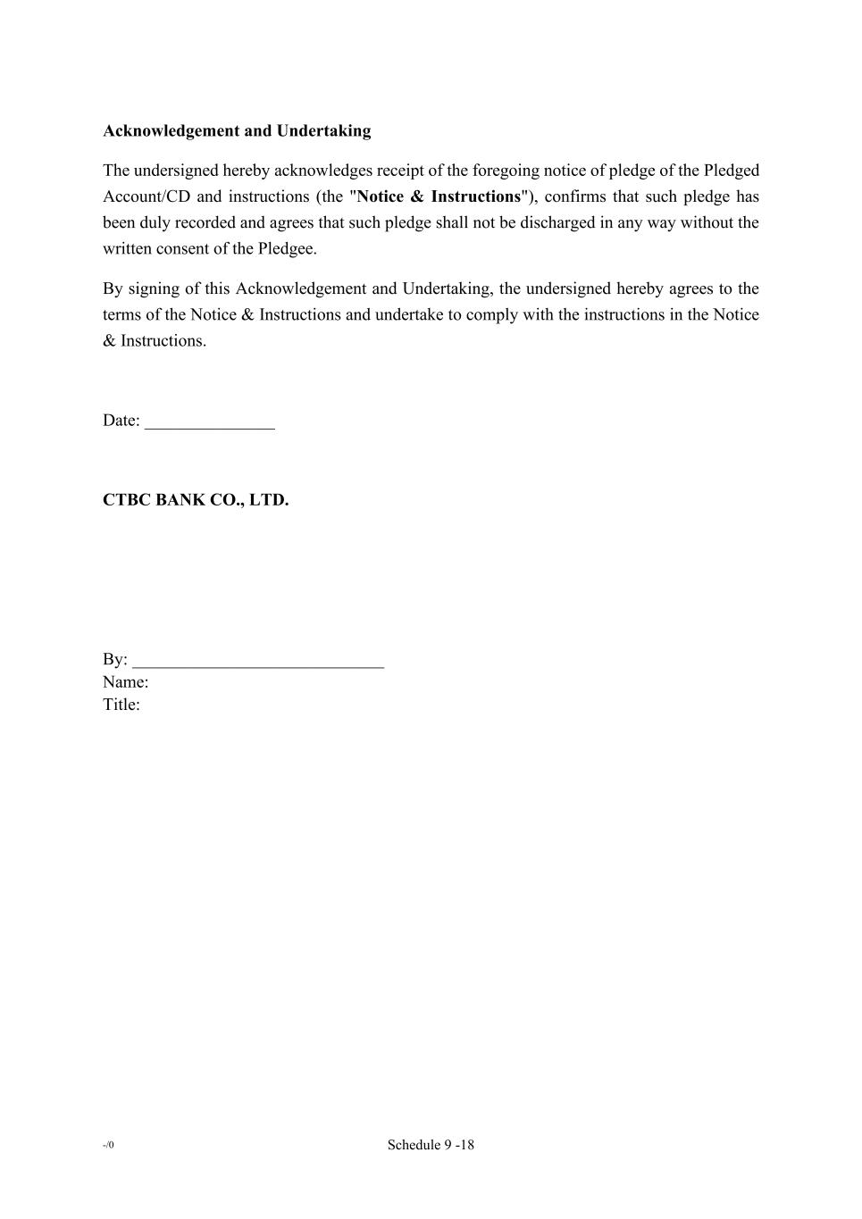-/0 Schedule 9 -18 Acknowledgement and Undertaking The undersigned hereby acknowledges receipt of the foregoing notice of pledge of the Pledged Account/CD and instructions (the "Notice & Instructions"), confirms that such pledge has been duly recorded and agrees that such pledge shall not be discharged in any way without the written consent of the Pledgee. By signing of this Acknowledgement and Undertaking, the undersigned hereby agrees to the terms of the Notice & Instructions and undertake to comply with the instructions in the Notice & Instructions. Date: _______________ CTBC BANK CO., LTD. By: _____________________________ Name: Title:
