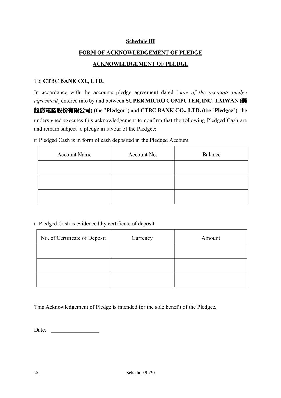 -/0 Schedule 9 -20 Schedule III FORM OF ACKNOWLEDGEMENT OF PLEDGE ACKNOWLEDGEMENT OF PLEDGE To: CTBC BANK CO., LTD. In accordance with the accounts pledge agreement dated [date of the accounts pledge agreement] entered into by and between SUPER MICRO COMPUTER, INC. TAIWAN (美 超微電腦股份有限公司) (the "Pledgor") and CTBC BANK CO., LTD. (the "Pledgee"), the undersigned executes this acknowledgement to confirm that the following Pledged Cash are and remain subject to pledge in favour of the Pledgee: □ Pledged Cash is in form of cash deposited in the Pledged Account Account Name Account No. Balance □ Pledged Cash is evidenced by certificate of deposit No. of Certificate of Deposit Currency Amount This Acknowledgement of Pledge is intended for the sole benefit of the Pledgee. Date: _________________