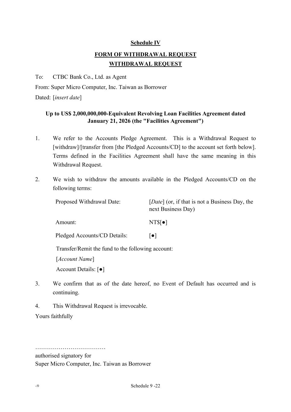 -/0 Schedule 9 -22 Schedule IV FORM OF WITHDRAWAL REQUEST WITHDRAWAL REQUEST To: CTBC Bank Co., Ltd. as Agent From: Super Micro Computer, Inc. Taiwan as Borrower Dated: [insert date] Up to US$ 2,000,000,000-Equivalent Revolving Loan Facilities Agreement dated January 21, 2026 (the "Facilities Agreement") 1. We refer to the Accounts Pledge Agreement. This is a Withdrawal Request to [withdraw]/[transfer from [the Pledged Accounts/CD] to the account set forth below]. Terms defined in the Facilities Agreement shall have the same meaning in this Withdrawal Request. 2. We wish to withdraw the amounts available in the Pledged Accounts/CD on the following terms: Proposed Withdrawal Date: [Date] (or, if that is not a Business Day, the next Business Day) Amount: NT$[●] Pledged Accounts/CD Details: [●] Transfer/Remit the fund to the following account: [Account Name] Account Details: [●] 3. We confirm that as of the date hereof, no Event of Default has occurred and is continuing. 4. This Withdrawal Request is irrevocable. Yours faithfully ……………………………… authorised signatory for Super Micro Computer, Inc. Taiwan as Borrower