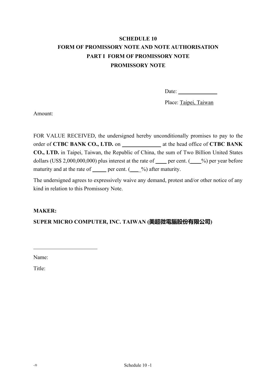 -/0 Schedule 10 -1 SCHEDULE 10 FORM OF PROMISSORY NOTE AND NOTE AUTHORISATION PART I FORM OF PROMISSORY NOTE PROMISSORY NOTE Date: ______________ Place: Taipei, Taiwan Amount: FOR VALUE RECEIVED, the undersigned hereby unconditionally promises to pay to the order of CTBC BANK CO., LTD. on ______________ at the head office of CTBC BANK CO., LTD. in Taipei, Taiwan, the Republic of China, the sum of Two Billion United States dollars (US$ 2,000,000,000) plus interest at the rate of ____ per cent. (____%) per year before maturity and at the rate of _____ per cent. (____%) after maturity. The undersigned agrees to expressively waive any demand, protest and/or other notice of any kind in relation to this Promissory Note. MAKER: SUPER MICRO COMPUTER, INC. TAIWAN (美超微電腦股份有限公司) _______________________ Name: Title: