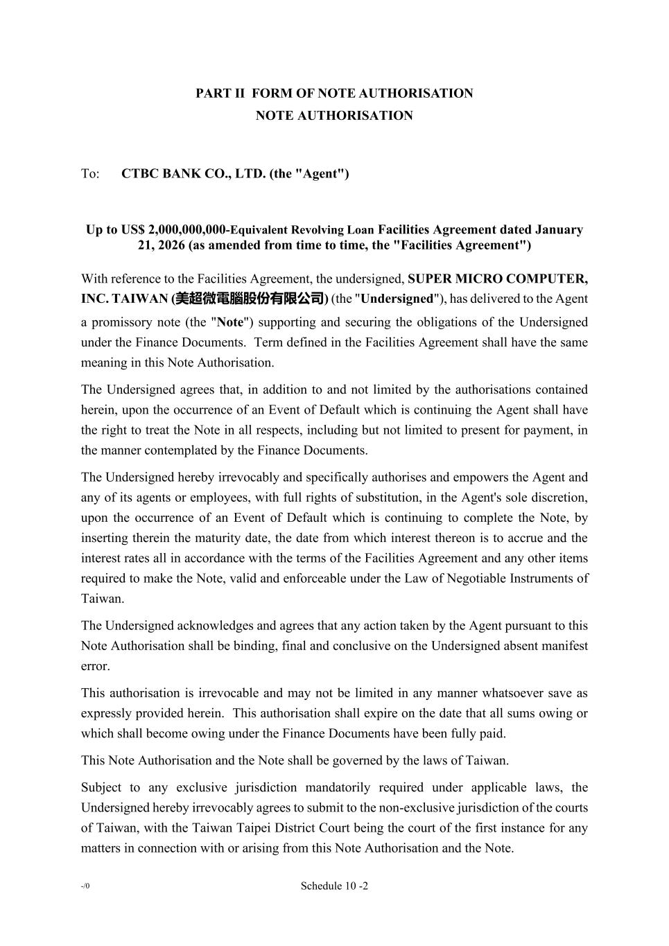-/0 Schedule 10 -2 PART II FORM OF NOTE AUTHORISATION NOTE AUTHORISATION To: CTBC BANK CO., LTD. (the "Agent") Up to US$ 2,000,000,000-Equivalent Revolving Loan Facilities Agreement dated January 21, 2026 (as amended from time to time, the "Facilities Agreement") With reference to the Facilities Agreement, the undersigned, SUPER MICRO COMPUTER, INC. TAIWAN (美超微電腦股份有限公司) (the "Undersigned"), has delivered to the Agent a promissory note (the "Note") supporting and securing the obligations of the Undersigned under the Finance Documents. Term defined in the Facilities Agreement shall have the same meaning in this Note Authorisation. The Undersigned agrees that, in addition to and not limited by the authorisations contained herein, upon the occurrence of an Event of Default which is continuing the Agent shall have the right to treat the Note in all respects, including but not limited to present for payment, in the manner contemplated by the Finance Documents. The Undersigned hereby irrevocably and specifically authorises and empowers the Agent and any of its agents or employees, with full rights of substitution, in the Agent's sole discretion, upon the occurrence of an Event of Default which is continuing to complete the Note, by inserting therein the maturity date, the date from which interest thereon is to accrue and the interest rates all in accordance with the terms of the Facilities Agreement and any other items required to make the Note, valid and enforceable under the Law of Negotiable Instruments of Taiwan. The Undersigned acknowledges and agrees that any action taken by the Agent pursuant to this Note Authorisation shall be binding, final and conclusive on the Undersigned absent manifest error. This authorisation is irrevocable and may not be limited in any manner whatsoever save as expressly provided herein. This authorisation shall expire on the date that all sums owing or which shall become owing under the Finance Documents have been fully paid. This Note Authorisation and the Note shall be governed by the laws of Taiwan. Subject to any exclusive jurisdiction mandatorily required under applicable laws, the Undersigned hereby irrevocably agrees to submit to the non-exclusive jurisdiction of the courts of Taiwan, with the Taiwan Taipei District Court being the court of the first instance for any matters in connection with or arising from this Note Authorisation and the Note.