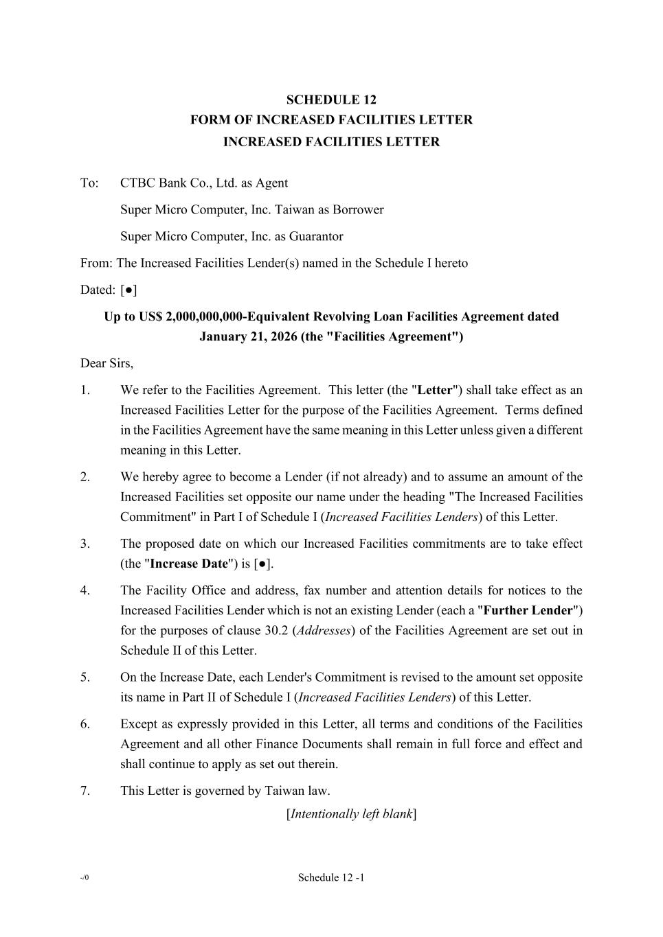 -/0 Schedule 12 -1 SCHEDULE 12 FORM OF INCREASED FACILITIES LETTER INCREASED FACILITIES LETTER To: CTBC Bank Co., Ltd. as Agent Super Micro Computer, Inc. Taiwan as Borrower Super Micro Computer, Inc. as Guarantor From: The Increased Facilities Lender(s) named in the Schedule I hereto Dated: [●] Up to US$ 2,000,000,000-Equivalent Revolving Loan Facilities Agreement dated January 21, 2026 (the "Facilities Agreement") Dear Sirs, 1. We refer to the Facilities Agreement. This letter (the "Letter") shall take effect as an Increased Facilities Letter for the purpose of the Facilities Agreement. Terms defined in the Facilities Agreement have the same meaning in this Letter unless given a different meaning in this Letter. 2. We hereby agree to become a Lender (if not already) and to assume an amount of the Increased Facilities set opposite our name under the heading "The Increased Facilities Commitment" in Part I of Schedule I (Increased Facilities Lenders) of this Letter. 3. The proposed date on which our Increased Facilities commitments are to take effect (the "Increase Date") is [●]. 4. The Facility Office and address, fax number and attention details for notices to the Increased Facilities Lender which is not an existing Lender (each a "Further Lender") for the purposes of clause 30.2 (Addresses) of the Facilities Agreement are set out in Schedule II of this Letter. 5. On the Increase Date, each Lender's Commitment is revised to the amount set opposite its name in Part II of Schedule I (Increased Facilities Lenders) of this Letter. 6. Except as expressly provided in this Letter, all terms and conditions of the Facilities Agreement and all other Finance Documents shall remain in full force and effect and shall continue to apply as set out therein. 7. This Letter is governed by Taiwan law. [Intentionally left blank]