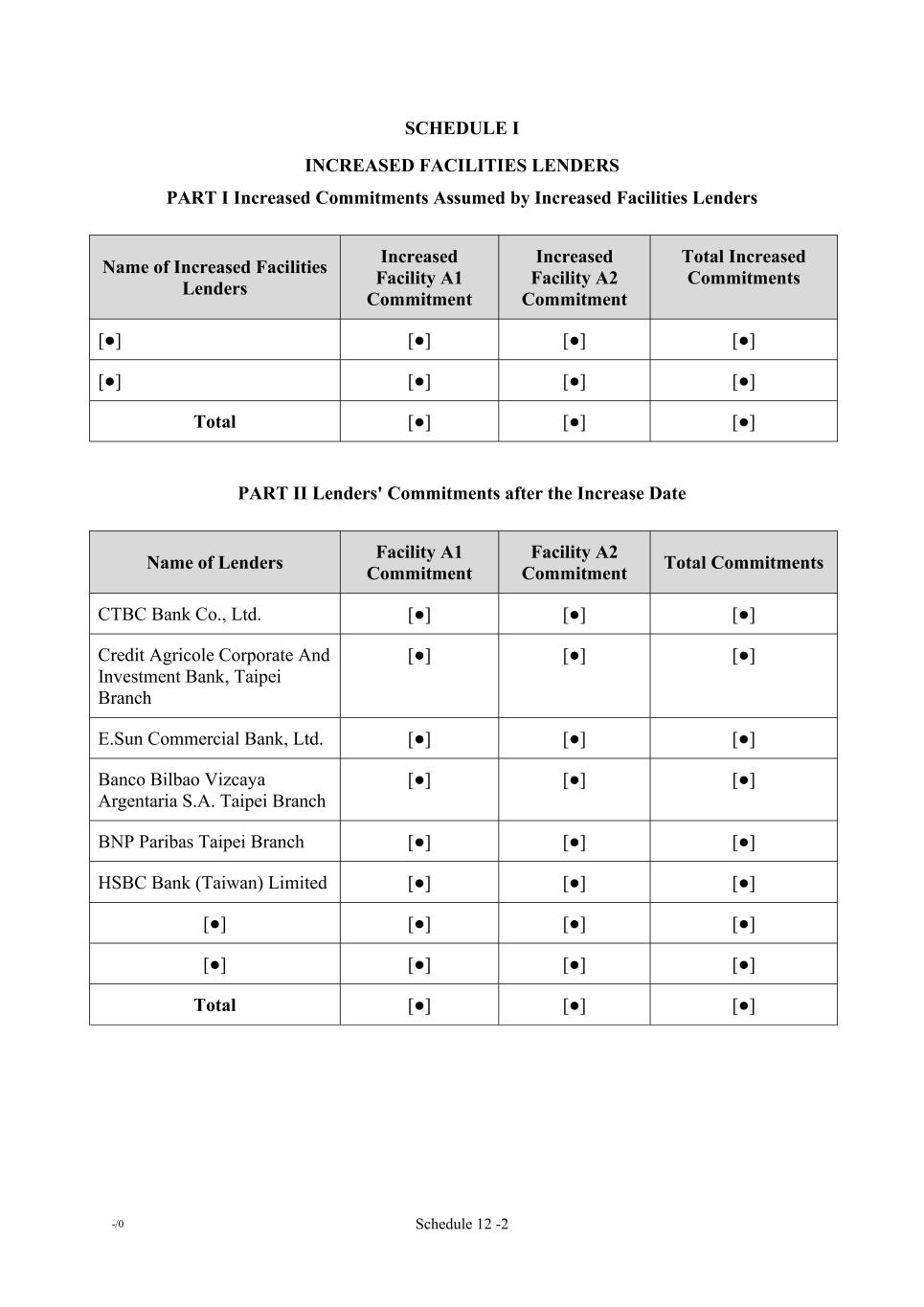 -/0 Schedule 12 -2 SCHEDULE I INCREASED FACILITIES LENDERS PART I Increased Commitments Assumed by Increased Facilities Lenders PART II Lenders' Commitments after the Increase Date Name of Increased Facilities Lenders Increased Facility A1 Commitment Increased Facility A2 Commitment Total Increased Commitments [●] [●] [●] [●] [●] [●] [●] [●] Total [●] [●] [●] Name of Lenders Facility A1 Commitment Facility A2 Commitment Total Commitments CTBC Bank Co., Ltd. [●] [●] [●] Credit Agricole Corporate And Investment Bank, Taipei Branch [●] [●] [●] E.Sun Commercial Bank, Ltd. [●] [●] [●] Banco Bilbao Vizcaya Argentaria S.A. Taipei Branch [●] [●] [●] BNP Paribas Taipei Branch [●] [●] [●] HSBC Bank (Taiwan) Limited [●] [●] [●] [●] [●] [●] [●] [●] [●] [●] [●] Total [●] [●] [●]