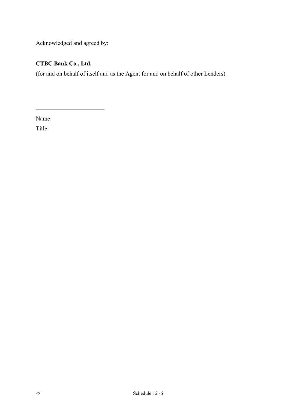 -/0 Schedule 12 -6 Acknowledged and agreed by: CTBC Bank Co., Ltd. (for and on behalf of itself and as the Agent for and on behalf of other Lenders) _______________________ Name: Title: