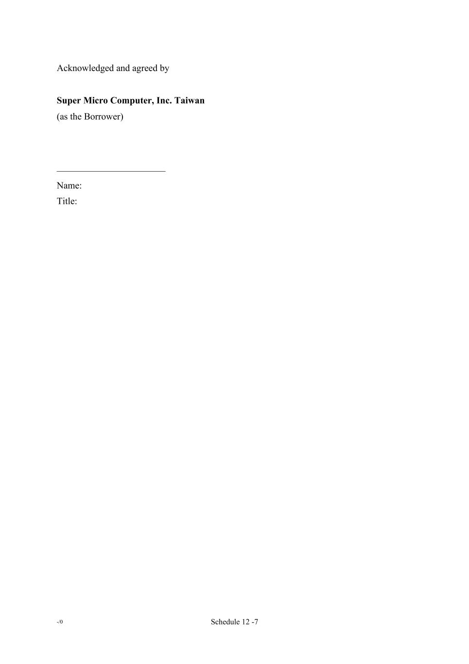 -/0 Schedule 12 -7 Acknowledged and agreed by Super Micro Computer, Inc. Taiwan (as the Borrower) _______________________ Name: Title: