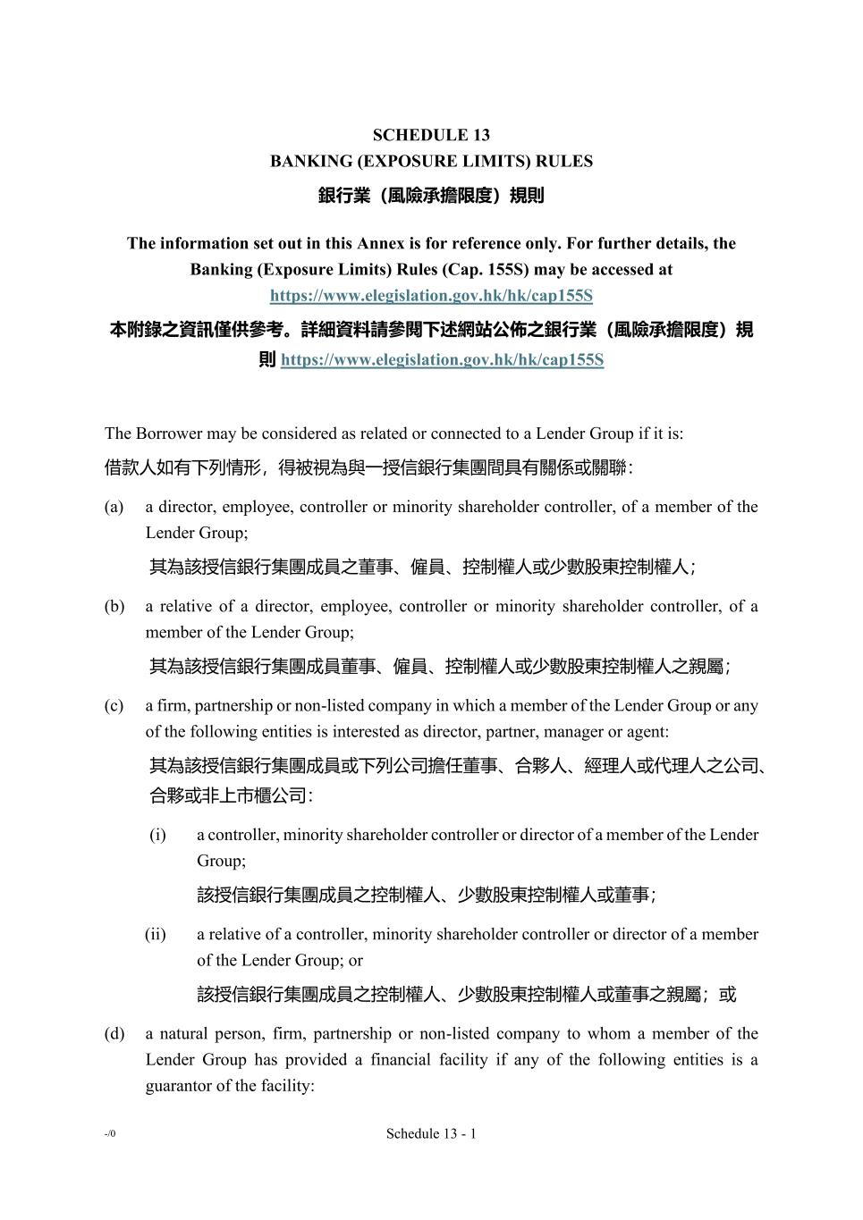 -/0 Schedule 13 - 1 SCHEDULE 13 BANKING (EXPOSURE LIMITS) RULES 銀行業(風險承擔限度)規則 The information set out in this Annex is for reference only. For further details, the Banking (Exposure Limits) Rules (Cap. 155S) may be accessed at https://www.elegislation.gov.hk/hk/cap155S 本附錄之資訊僅供參考。詳細資料請參閱下述網站公佈之銀行業(風險承擔限度)規 則 https://www.elegislation.gov.hk/hk/cap155S The Borrower may be considered as related or connected to a Lender Group if it is: 借款人如有下列情形,得被視為與一授信銀行集團間具有關係或關聯: (a) a director, employee, controller or minority shareholder controller, of a member of the Lender Group; 其為該授信銀行集團成員之董事、僱員、控制權人或少數股東控制權人; (b) a relative of a director, employee, controller or minority shareholder controller, of a member of the Lender Group; 其為該授信銀行集團成員董事、僱員、控制權人或少數股東控制權人之親屬; (c) a firm, partnership or non-listed company in which a member of the Lender Group or any of the following entities is interested as director, partner, manager or agent: 其為該授信銀行集團成員或下列公司擔任董事、合夥人、經理人或代理人之公司、 合夥或非上市櫃公司: (i) a controller, minority shareholder controller or director of a member of the Lender Group; 該授信銀行集團成員之控制權人、少數股東控制權人或董事; (ii) a relative of a controller, minority shareholder controller or director of a member of the Lender Group; or 該授信銀行集團成員之控制權人、少數股東控制權人或董事之親屬;或 (d) a natural person, firm, partnership or non-listed company to whom a member of the Lender Group has provided a financial facility if any of the following entities is a guarantor of the facility: