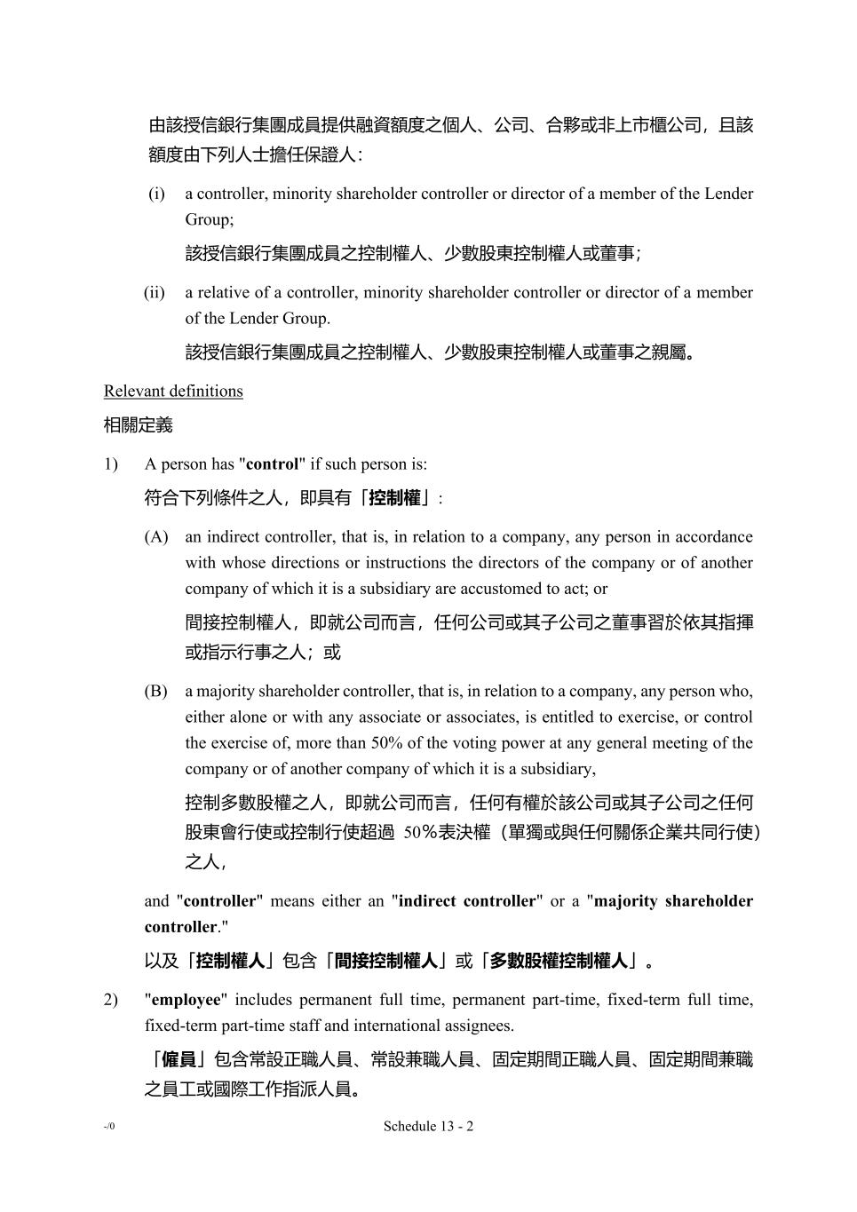 -/0 Schedule 13 - 2 由該授信銀行集團成員提供融資額度之個人、公司、合夥或非上市櫃公司,且該 額度由下列人士擔任保證人: (i) a controller, minority shareholder controller or director of a member of the Lender Group; 該授信銀行集團成員之控制權人、少數股東控制權人或董事; (ii) a relative of a controller, minority shareholder controller or director of a member of the Lender Group. 該授信銀行集團成員之控制權人、少數股東控制權人或董事之親屬。 Relevant definitions 相關定義 1) A person has "control" if such person is: 符合下列條件之人,即具有「控制權」: (A) an indirect controller, that is, in relation to a company, any person in accordance with whose directions or instructions the directors of the company or of another company of which it is a subsidiary are accustomed to act; or 間接控制權人,即就公司而言,任何公司或其子公司之董事習於依其指揮 或指示行事之人;或 (B) a majority shareholder controller, that is, in relation to a company, any person who, either alone or with any associate or associates, is entitled to exercise, or control the exercise of, more than 50% of the voting power at any general meeting of the company or of another company of which it is a subsidiary, 控制多數股權之人,即就公司而言,任何有權於該公司或其子公司之任何 股東會行使或控制行使超過 50%表決權(單獨或與任何關係企業共同行使) 之人, and "controller" means either an "indirect controller" or a "majority shareholder controller." 以及「控制權人」包含「間接控制權人」或「多數股權控制權人」。 2) "employee" includes permanent full time, permanent part-time, fixed-term full time, fixed-term part-time staff and international assignees. 「僱員」包含常設正職人員、常設兼職人員、固定期間正職人員、固定期間兼職 之員工或國際工作指派人員。