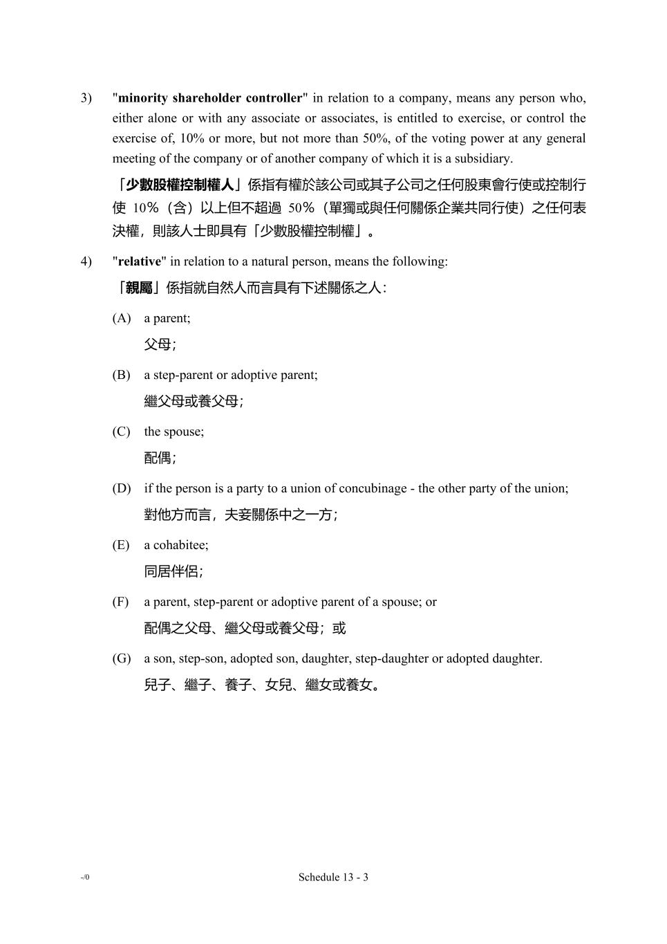 -/0 Schedule 13 - 3 3) "minority shareholder controller" in relation to a company, means any person who, either alone or with any associate or associates, is entitled to exercise, or control the exercise of, 10% or more, but not more than 50%, of the voting power at any general meeting of the company or of another company of which it is a subsidiary. 「少數股權控制權人」係指有權於該公司或其子公司之任何股東會行使或控制行 使 10%(含)以上但不超過 50%(單獨或與任何關係企業共同行使)之任何表 決權,則該人士即具有「少數股權控制權」。 4) "relative" in relation to a natural person, means the following: 「親屬」係指就自然人而言具有下述關係之人: (A) a parent; 父母; (B) a step-parent or adoptive parent; 繼父母或養父母; (C) the spouse; 配偶; (D) if the person is a party to a union of concubinage - the other party of the union; 對他方而言,夫妾關係中之一方; (E) a cohabitee; 同居伴侶; (F) a parent, step-parent or adoptive parent of a spouse; or 配偶之父母、繼父母或養父母;或 (G) a son, step-son, adopted son, daughter, step-daughter or adopted daughter. 兒子、繼子、養子、女兒、繼女或養女。