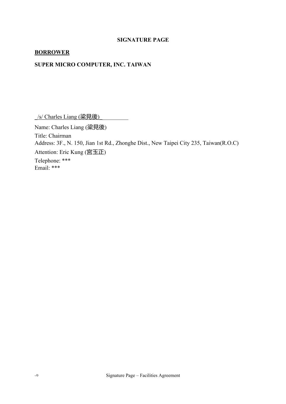 -/0 Signature Page – Facilities Agreement SIGNATURE PAGE BORROWER SUPER MICRO COMPUTER, INC. TAIWAN _/s/ Charles Liang (梁見後)__________ Name: Charles Liang (梁見後) Title: Chairman Address: 3F., N. 150, Jian 1st Rd., Zhonghe Dist., New Taipei City 235, Taiwan(R.O.C) Attention: Eric Kung (宮玉正) Telephone: *** Email: ***