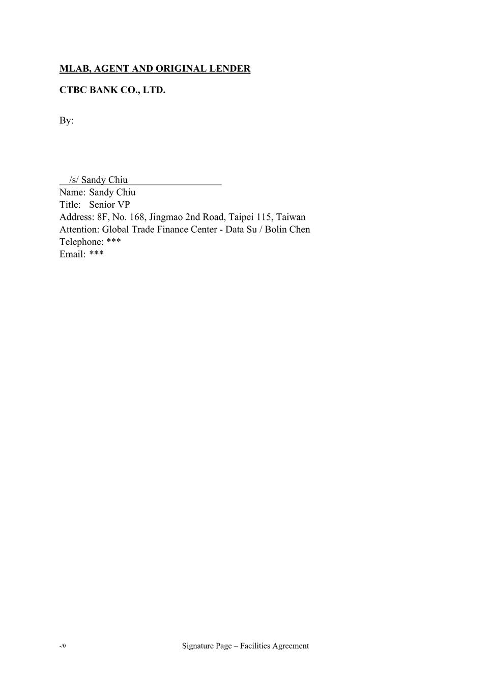-/0 Signature Page – Facilities Agreement MLAB, AGENT AND ORIGINAL LENDER CTBC BANK CO., LTD. By: __/s/ Sandy Chiu___________________ Name: Sandy Chiu Title: Senior VP Address: 8F, No. 168, Jingmao 2nd Road, Taipei 115, Taiwan Attention: Global Trade Finance Center - Data Su / Bolin Chen Telephone: *** Email: ***