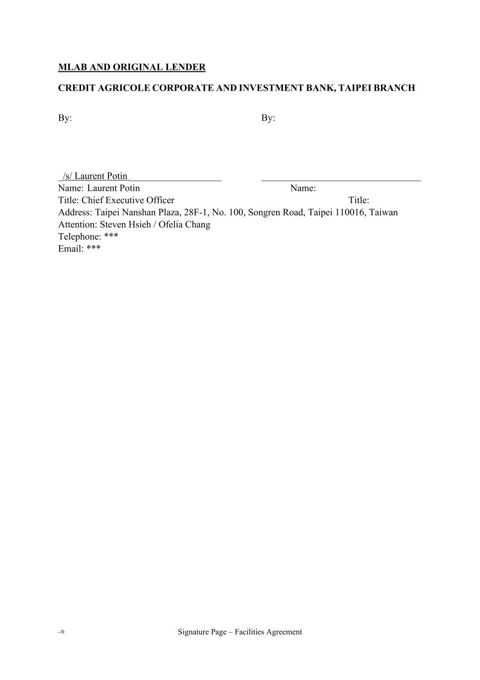 -/0 Signature Page – Facilities Agreement MLAB AND ORIGINAL LENDER CREDIT AGRICOLE CORPORATE AND INVESTMENT BANK, TAIPEI BRANCH By: By: _/s/ Laurent Potin ___________________ _________________________________ Name: Laurent Potin Name: Title: Chief Executive Officer Title: Address: Taipei Nanshan Plaza, 28F-1, No. 100, Songren Road, Taipei 110016, Taiwan Attention: Steven Hsieh / Ofelia Chang Telephone: *** Email: ***