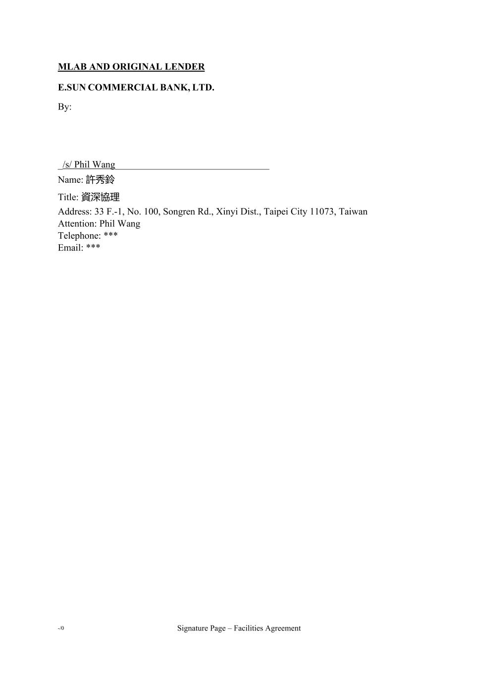 -/0 Signature Page – Facilities Agreement MLAB AND ORIGINAL LENDER E.SUN COMMERCIAL BANK, LTD. By: _/s/ Phil Wang________________________________ Name: 許秀鈴 Title: 資深協理 Address: 33 F.-1, No. 100, Songren Rd., Xinyi Dist., Taipei City 11073, Taiwan Attention: Phil Wang Telephone: *** Email: ***
