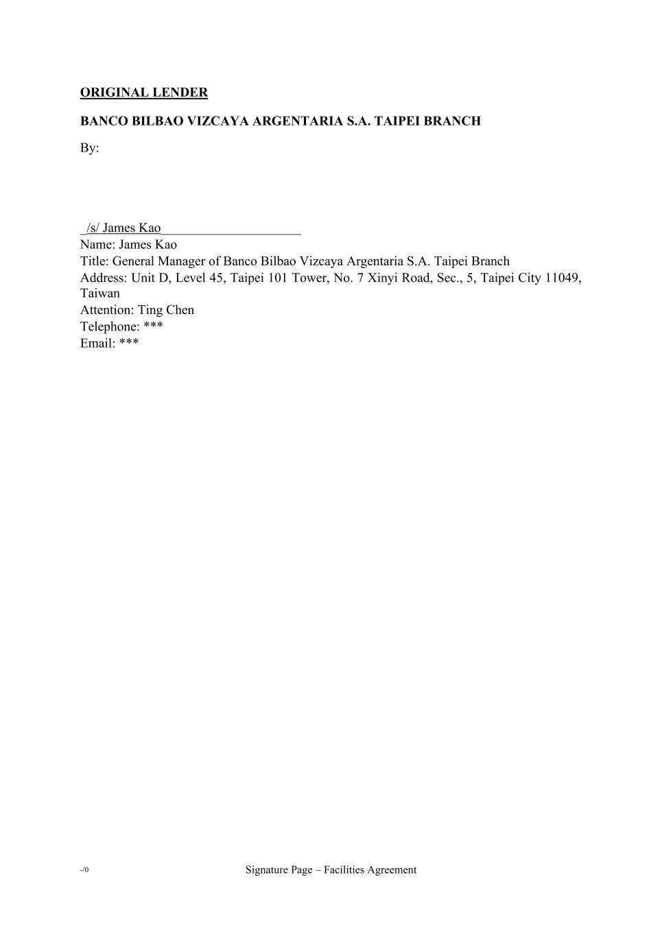 -/0 Signature Page – Facilities Agreement ORIGINAL LENDER BANCO BILBAO VIZCAYA ARGENTARIA S.A. TAIPEI BRANCH By: _/s/ James Kao_____________________ Name: James Kao Title: General Manager of Banco Bilbao Vizcaya Argentaria S.A. Taipei Branch Address: Unit D, Level 45, Taipei 101 Tower, No. 7 Xinyi Road, Sec., 5, Taipei City 11049, Taiwan Attention: Ting Chen Telephone: *** Email: ***