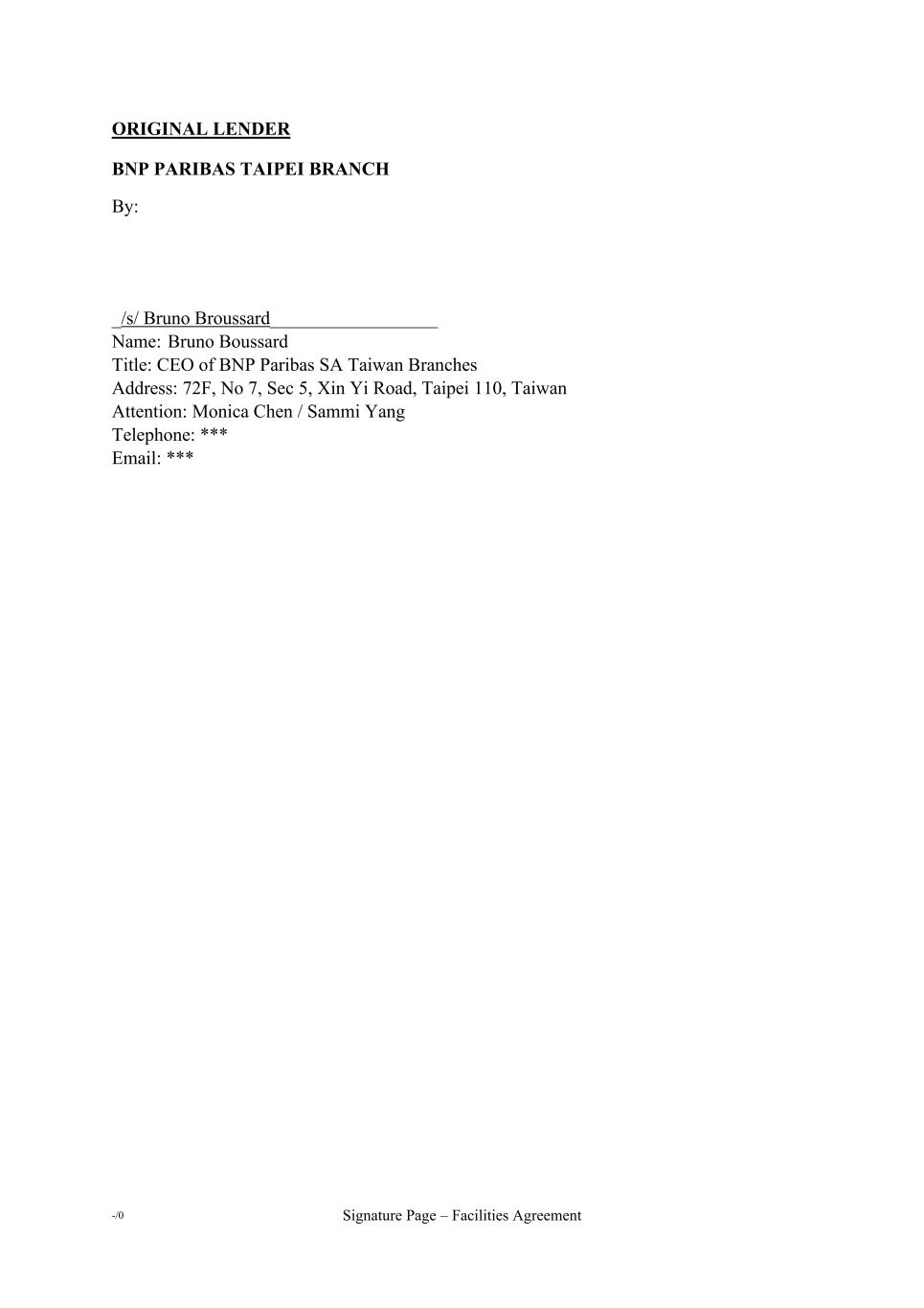 -/0 Signature Page – Facilities Agreement ORIGINAL LENDER BNP PARIBAS TAIPEI BRANCH By: _/s/ Bruno Broussard__________________ Name: Bruno Boussard Title: CEO of BNP Paribas SA Taiwan Branches Address: 72F, No 7, Sec 5, Xin Yi Road, Taipei 110, Taiwan Attention: Monica Chen / Sammi Yang Telephone: *** Email: ***