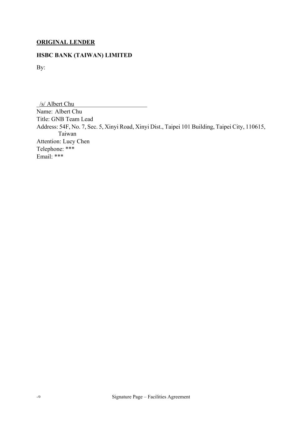 -/0 Signature Page – Facilities Agreement ORIGINAL LENDER HSBC BANK (TAIWAN) LIMITED By: _/s/ Albert Chu________________________ Name: Albert Chu Title: GNB Team Lead Address: 54F, No. 7, Sec. 5, Xinyi Road, Xinyi Dist., Taipei 101 Building, Taipei City, 110615, Taiwan Attention: Lucy Chen Telephone: *** Email: ***