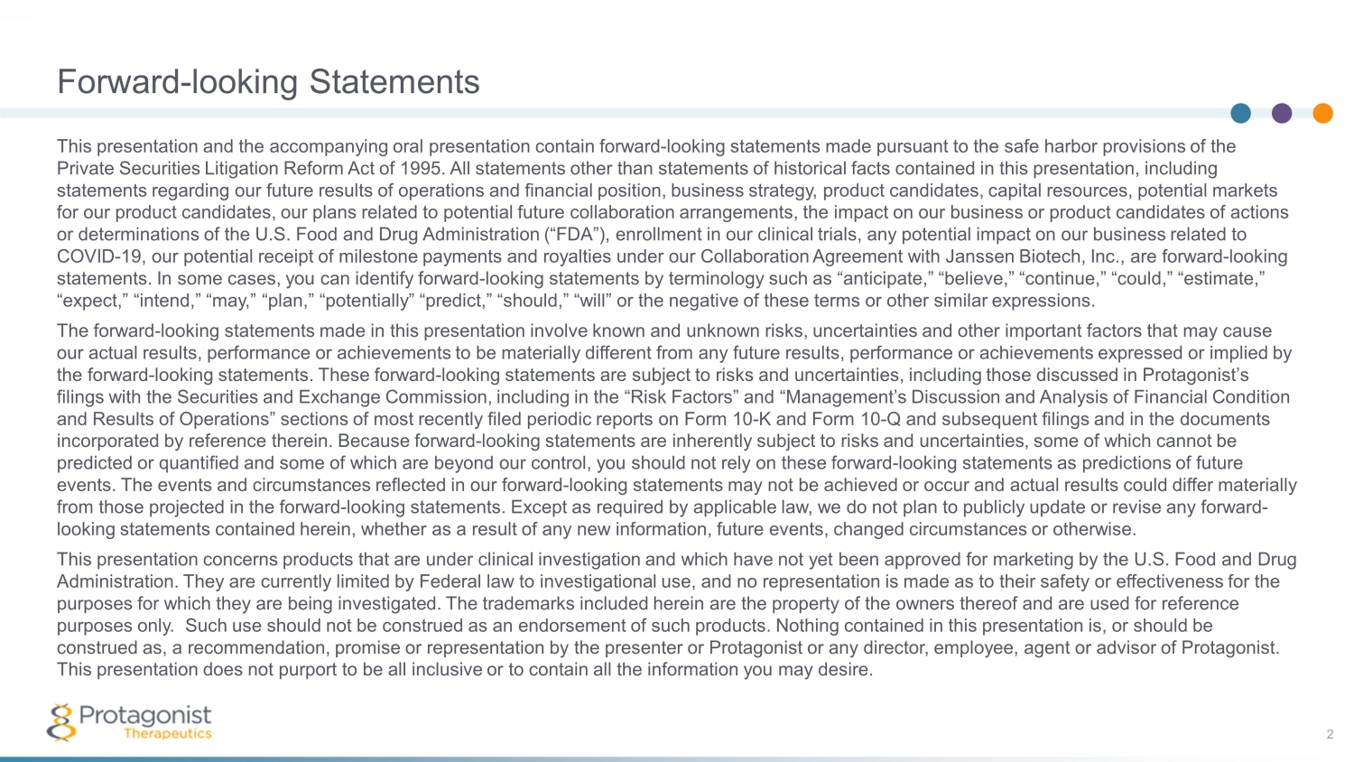 Forward - looking Statements 2 This presentation and the accompanying oral presentation contain forward - looking statements made pursuant to the safe harbor pro visions of the Private Securities Litigation Reform Act of 1995. All statements other than statements of historical facts contained in this pre sentation, including statements regarding our future results of operations and financial position, business strategy, product candidates, capital res ources, potential markets for our product candidates, our plans related to potential future collaboration arrangements, the impact on our business or p rod uct candidates of actions or determinations of the U.S. Food and Drug Administration (“FDA”), enrollment in our clinical trials, any potential impact o n o ur business related to COVID - 19, our potential receipt of milestone payments and royalties under our Collaboration Agreement with Janssen Biotech, Inc. , are forward - looking statements. In some cases, you can identify forward - looking statements by terminology such as “anticipate,” “believe,” “continue ,” “could,” “estimate,” “expect,” “intend,” “may,” “plan,” “potentially” “predict,” “should,” “will” or the negative of these terms or other similar exp ressions. The forward - looking statements made in this presentation involve known and unknown risks, uncertainties and other important fact ors that may cause our actual results, performance or achievements to be materially different from any future results, performance or achievemen ts expressed or implied by the forward - looking statements. These forward - looking statements are subject to risks and uncertainties, including those discuss ed in Protagonist’s filings with the Securities and Exchange Commission, including in the “Risk Factors” and “Management’s Discussion and Analysi s o f Financial Condition and Results of Operations” sections of most recently filed periodic reports on Form 10 - K and Form 10 - Q and subsequent filings an d in the documents incorporated by reference therein. Because forward - looking statements are inherently subject to risks and uncertainties, some of which cannot be predicted or quantified and some of which are beyond our control, you should not rely on these forward - looking statements as pre dictions of future events. The events and circumstances reflected in our forward - looking statements may not be achieved or occur and actual results could differ materially from those projected in the forward - looking statements. Except as required by applicable law, we do not plan to publicly update or revise any forward - looking statements contained herein, whether as a result of any new information, future events, changed circumstances or othe rwi se. This presentation concerns products that are under clinical investigation and which have not yet been approved for marketing by the U.S. Food and Drug Administration. They are currently limited by Federal law to investigational use, and no representation is made as to their s afe ty or effectiveness for the purposes for which they are being investigated. The trademarks included herein are the property of the owners thereof and are us ed for reference purposes only. Such use should not be construed as an endorsement of such products. Nothing contained in this presentation i s, or should be construed as, a recommendation, promise or representation by the presenter or Protagonist or any director, employee, agent or ad visor of Protagonist. This presentation does not purport to be all inclusive or to contain all the information you may desire.