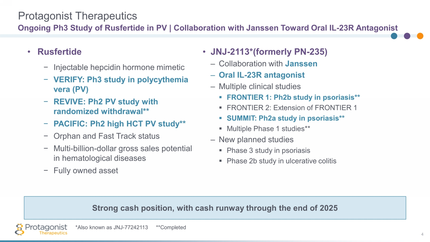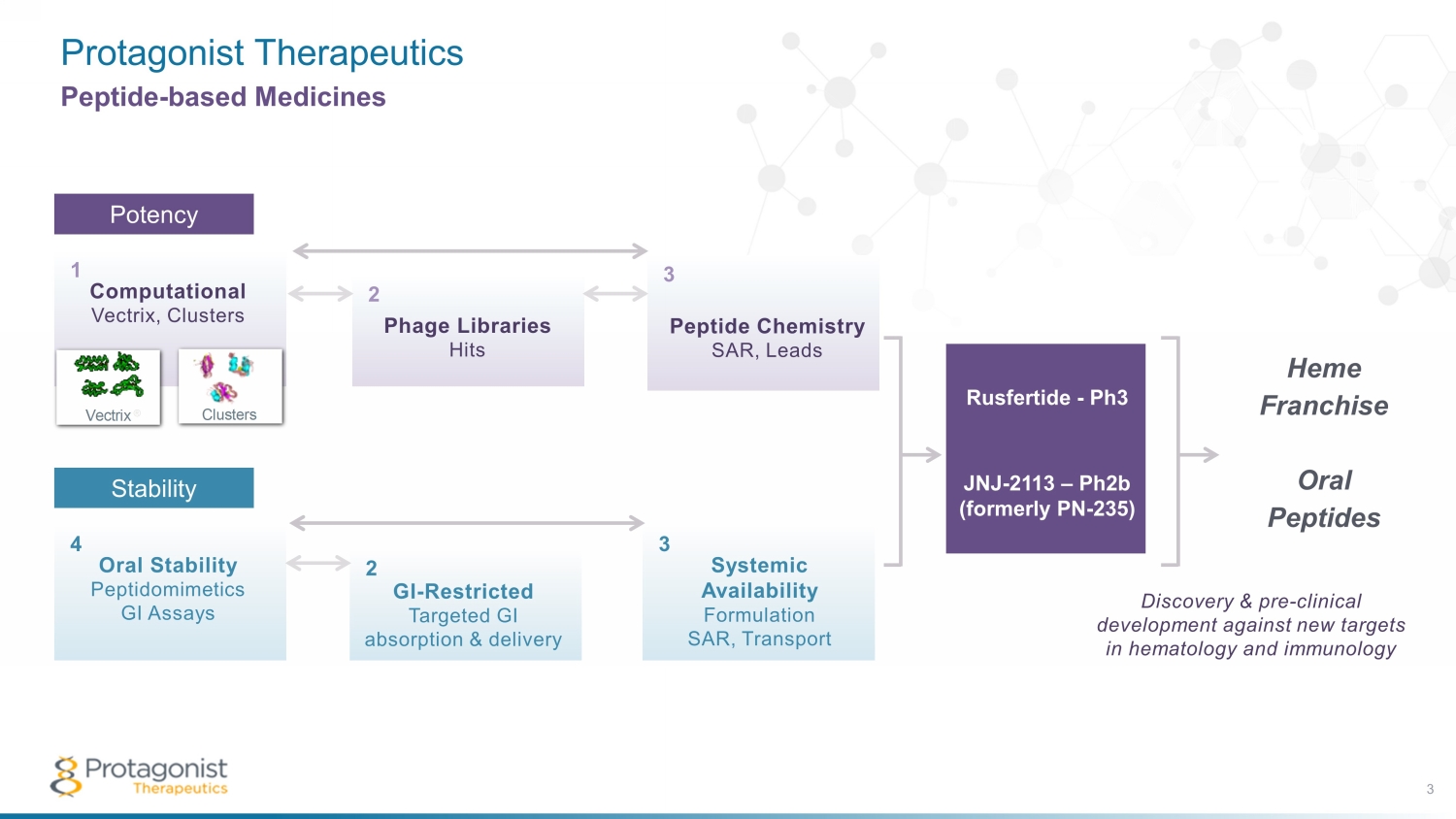 Protagonist Therapeutics 3 Peptide - based Medicines Potency Peptide Chemistry SAR, Leads Phage Libraries Hits Computational Vectrix, Clusters Vectrix ® Clusters 1 2 3 POTENCY Oral Stability Peptidomimetics GI Assays GI-Restricted Targeted GI absorption & delivery Systemic Availability Formulation SAR, Transport 4 5 6 STABILITY Computational Vectrix , Clusters 1 Peptide Chemistry SAR, Leads Phage Libraries Hits Computational Vectrix, Clusters Vectrix ® Clusters 1 2 3 POTENCY Oral Stability Peptidomimetics GI Assays GI-Restricted Targeted GI absorption & delivery Systemic Availability Formulation SAR, Transport 4 5 6 STABILITY Peptide Chemistry SAR, Leads 3 Phage Libraries Hits 2 Stability Oral Stability Peptidomimetics GI Assays 4 Systemic Availability Formulation SAR, Transport 3 GI - Restricted Targeted GI absorption & delivery 2 Rusfertide - Ph3 JNJ - 2113 – P h2b (formerly PN - 235) Heme Franchise Oral Peptides Discovery & pre - clinical development against new targets in hematology and immunology
