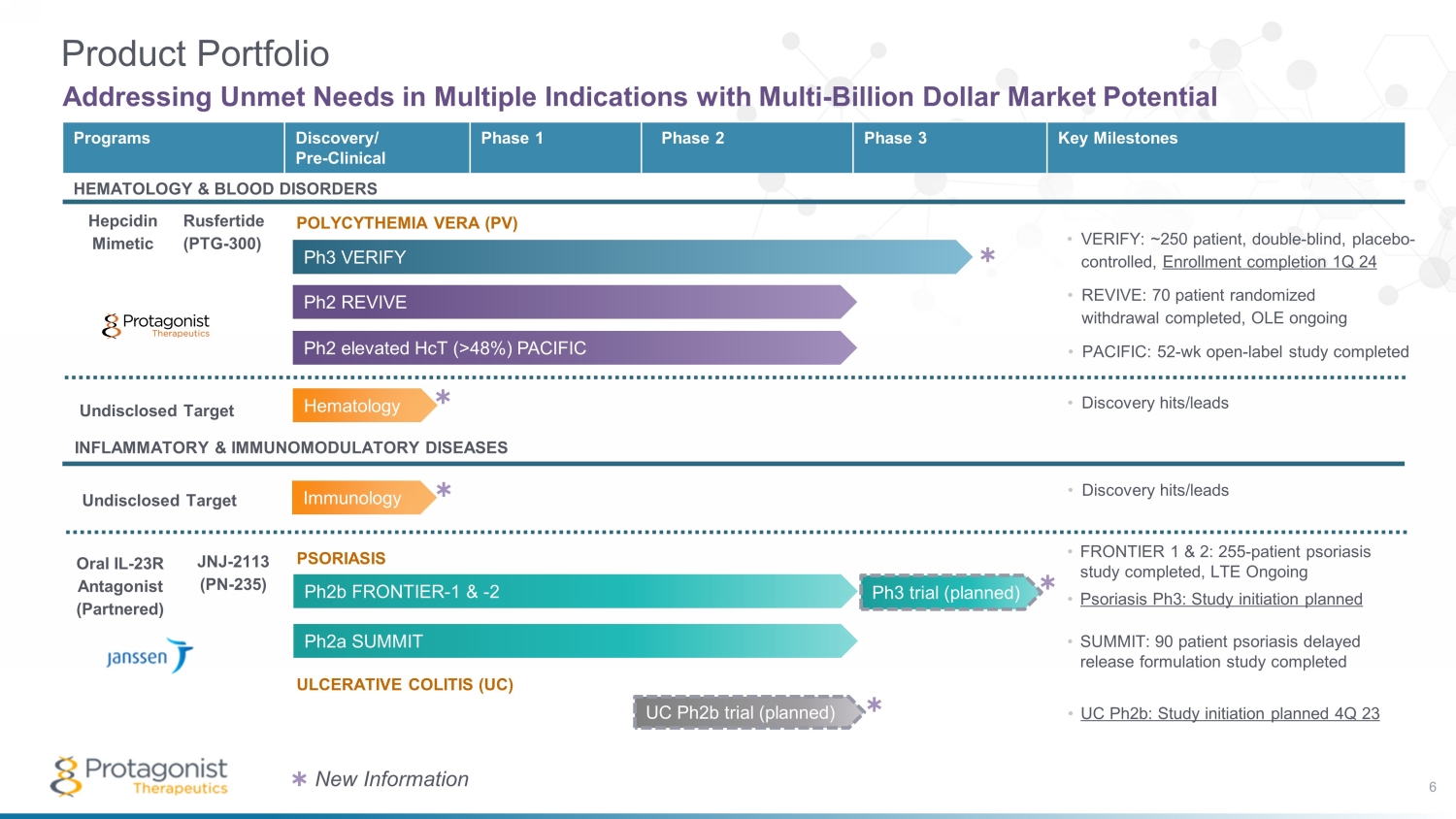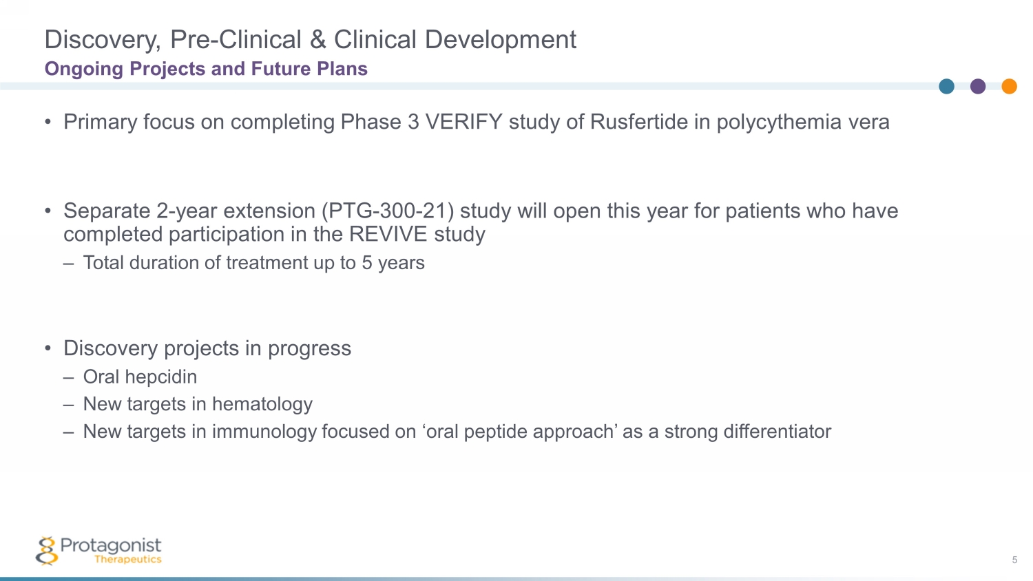 Ongoing Ph3 Study of Rusfertide in PV | Collaboration with Janssen Toward Oral IL - 23R Antagonist 4 • JNJ - 2113*(formerly PN - 235) – Collaboration with Janssen – Oral IL - 23R antagonist – Multiple clinical studies ▪ FRONTIER 1: Ph2b study in psoriasis** ▪ FRONTIER 2: Extension of FRONTIER 1 ▪ SUMMIT: Ph2a study in psoriasis** ▪ Multiple Phase 1 studies** – New planned studies ▪ Phase 3 study in psoriasis ▪ Phase 2b study in ulcerative colitis • Rusfertide − Injectable hepcidin hormone mimetic − VERIFY: Ph3 study in polycythemia vera (PV) − REVIVE: Ph2 PV study with randomized withdrawal** − PACIFIC: Ph2 high HCT PV study** − Orphan and Fast Track status − Multi - billion - dollar gross sales potential in hematological diseases − Fully owned asset Strong cash position, with cash runway through the end of 2025 *Also known as JNJ - 77242113 **Completed Protagonist Therapeutics