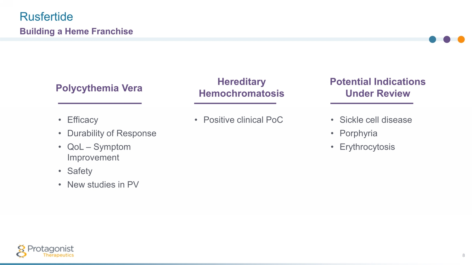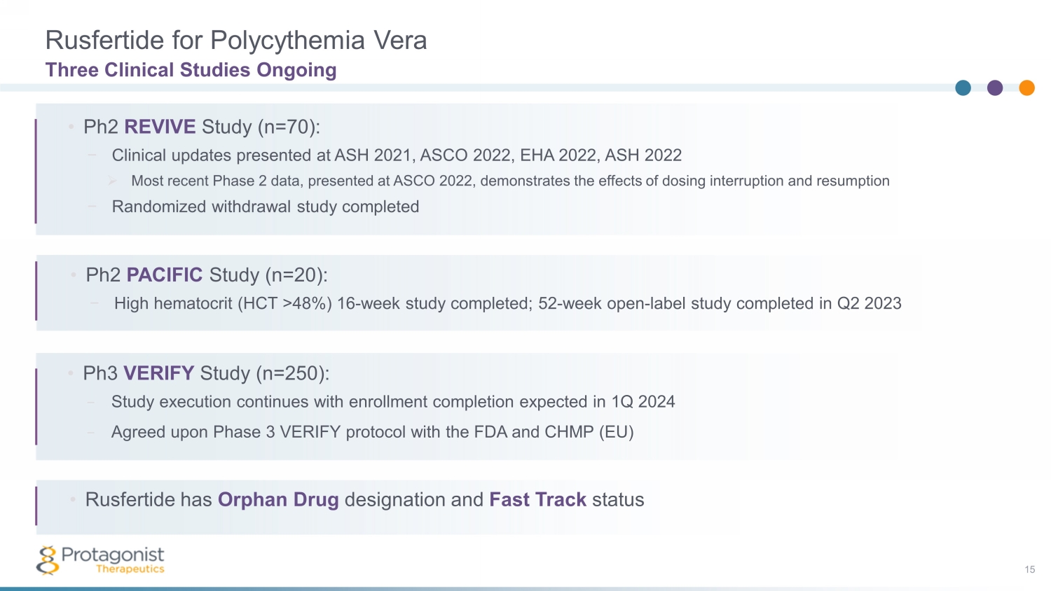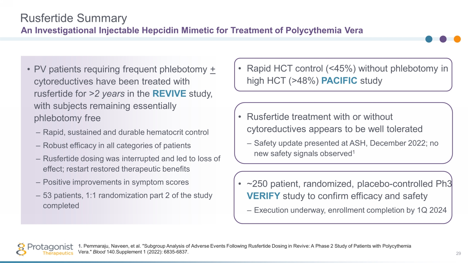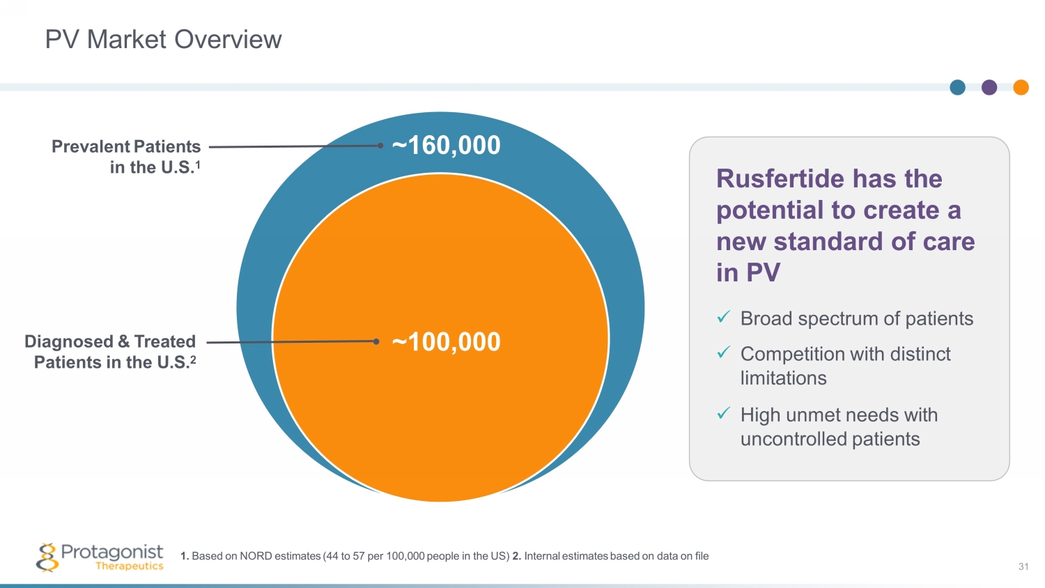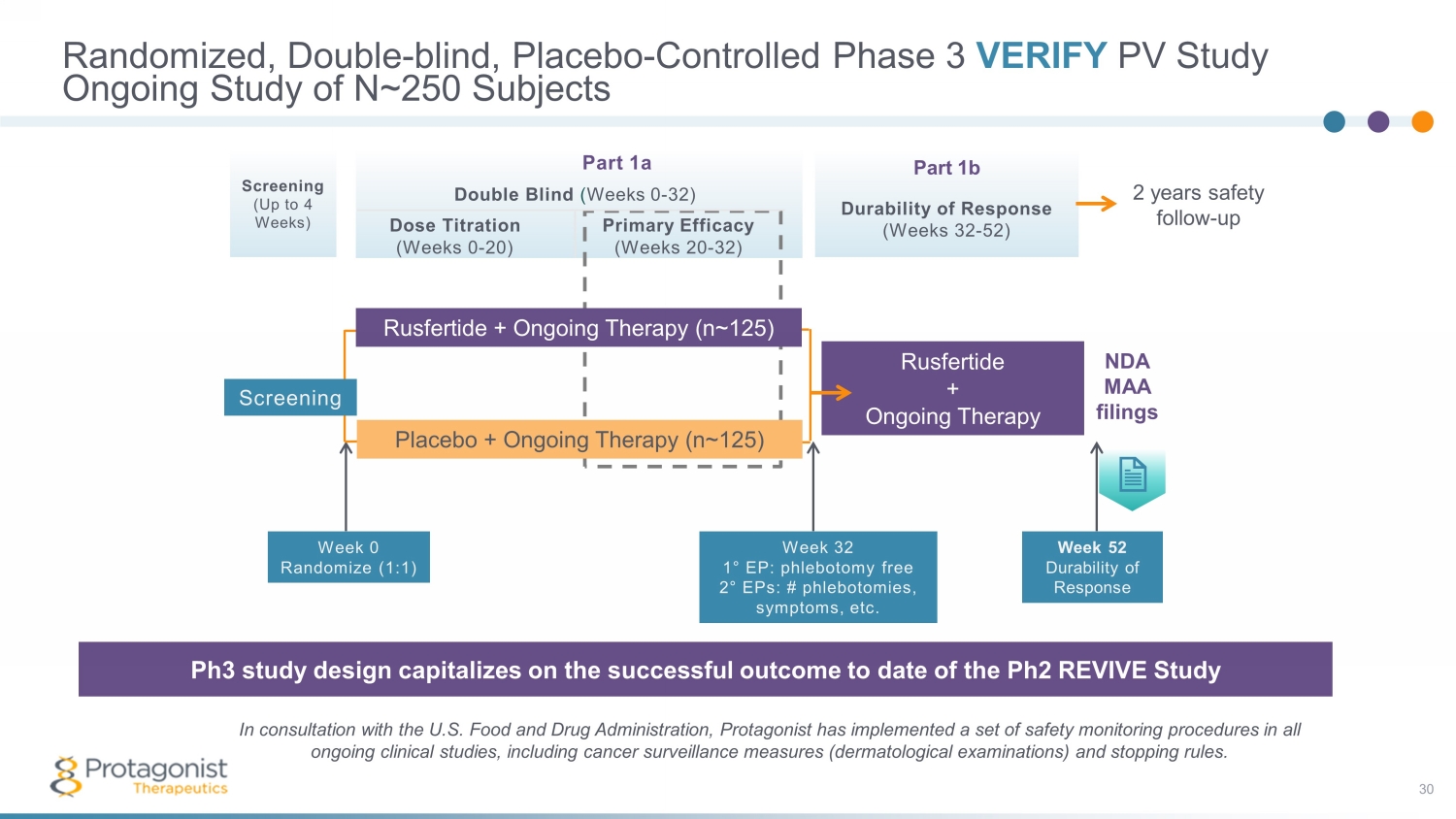 Part 1a Double Blind ( Weeks 0 - 32) Dose Titration Primary Efficacy (Weeks 0 - 20) (Weeks 20 - 32) Part 1b Durability of Response (Weeks 32 - 52) Screening (Up to 4 Weeks) Randomized, Double - blind, Placebo - Controlled Phase 3 VERIFY PV Study 30 Ongoing Study of N~250 Subjects The Phase 3 study design capitalizes on the successful outcome of the 60 - plus patient open - label Phase 2 REVIVE Study In consultation with the U.S. Food and Drug Administration, Protagonist has implemented a set of safety monitoring procedures in all ongoing clinical studies, including cancer surveillance measures (dermatological examinations) and stopping rules. Ph3 study design capitalizes on the successful outcome to date of the Ph2 REVIVE Study Week 32 1 ° EP: phlebotomy free 2 ° EPs: # phlebotomies, symptoms, etc. Placebo + Ongoing Therapy (n~ 125 ) Rusfertide + Ongoing Therapy Rusfertide + Ongoing Therapy (n~ 125 ) Week 52 Durability of Response NDA MAA filings Week 0 Randomize (1:1) Screening 2 years safety follow - up