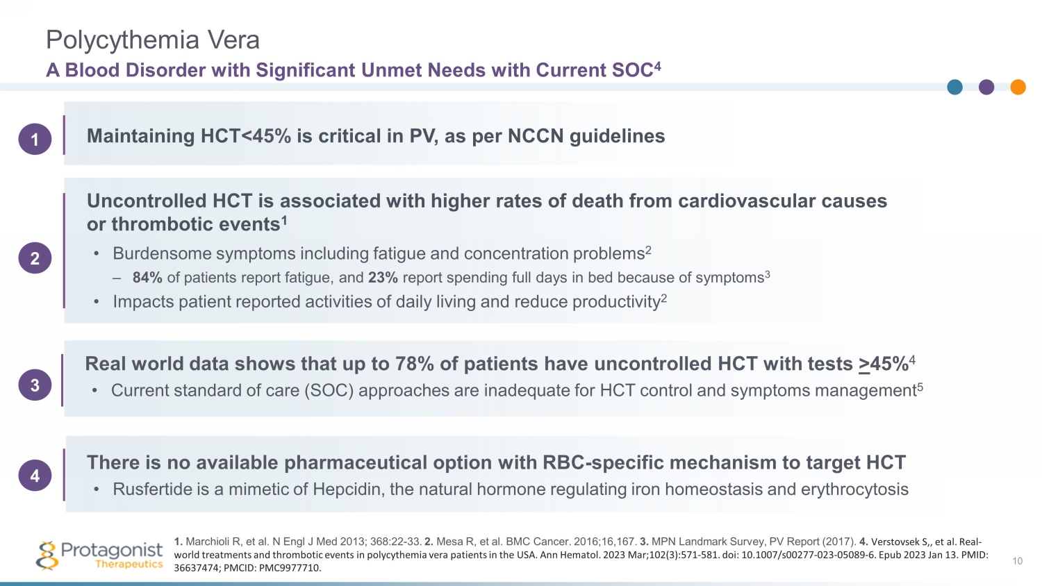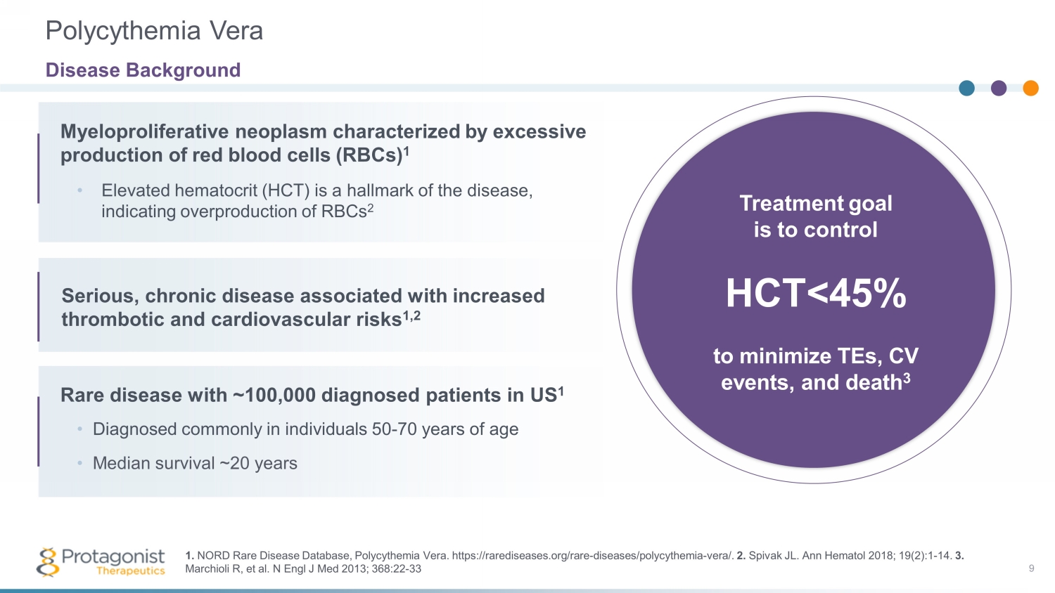 Myeloproliferative neoplasm characterized by excessive production of red blood cells ( RBCs) 1 Treatment goal is to control HCT <45% to minimize TEs, CV events, and death 3 9 • Elevated hematocrit (HCT) is a hallmark of the disease, indicating overproduction of RBCs 2 Serious, chronic disease associated with increased thrombotic and cardiovascular risks 1,2 Rare disease with ~100,000 diagnosed patients in US 1 • Diagnosed commonly in individuals 50 - 70 years of age • Median survival ~20 years Polycythemia Vera Disease Background 1. NORD Rare Disease Database, Polycythemia Vera. https://rarediseases.org/rare - diseases/polycythemia - vera/. 2. Spivak JL. Ann Hematol 2018; 19(2):1 - 14. 3. Marchioli R, et al. N Engl J Med 2013; 368:22 - 33