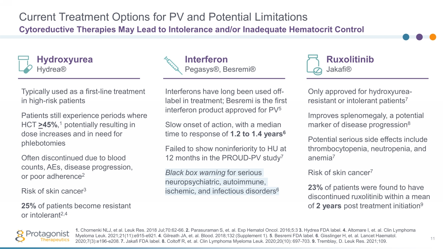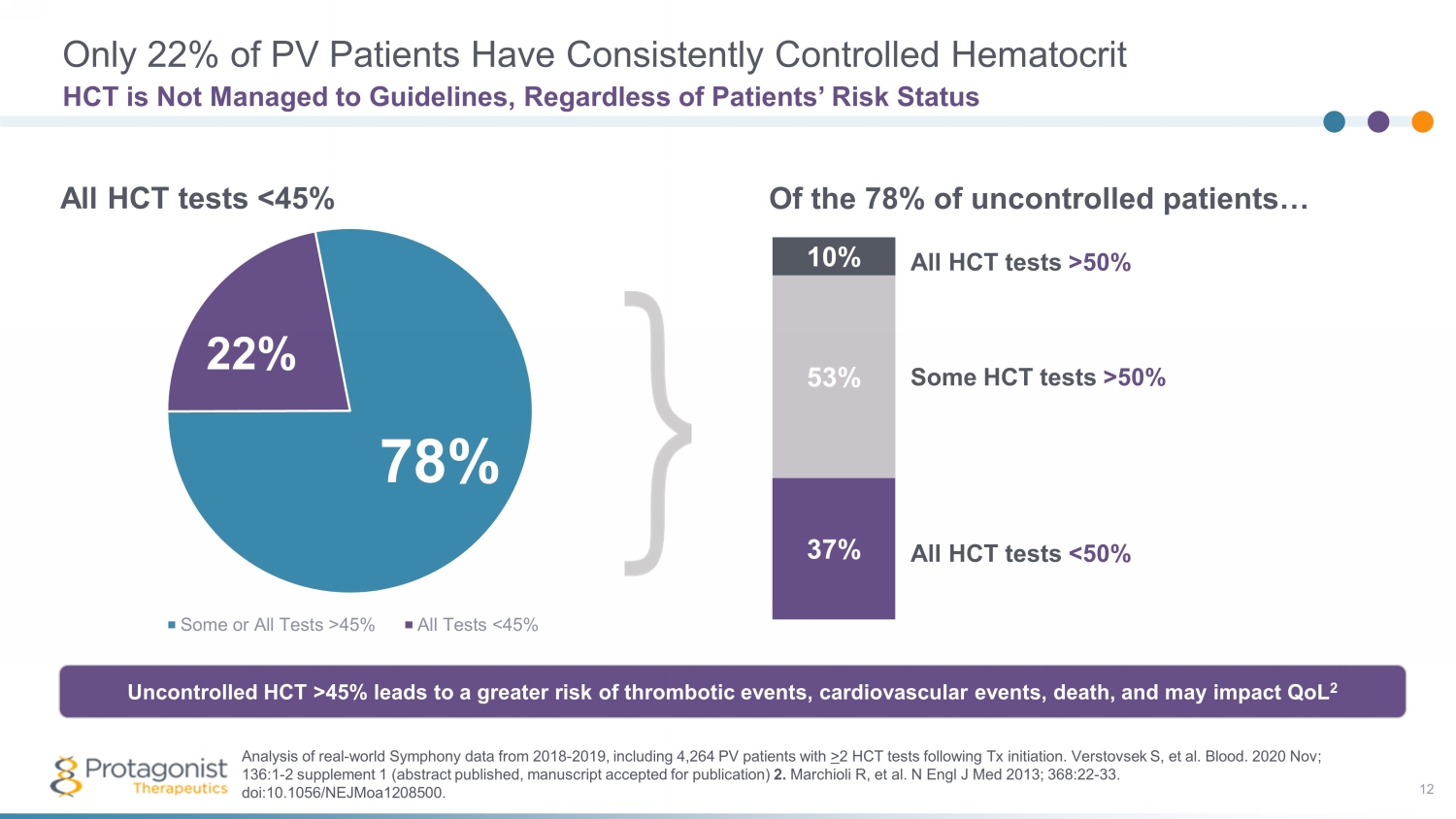 Current Treatment Options for PV and Potential Limitations 11 Cytoreductive Therapies May Lead to Intolerance and/or Inadequate Hematocrit Control Hydroxyurea Hydrea ® Typically used as a first - line treatment in high - risk patients Patients still experience periods where HCT > 45% , 1 potentially resulting in dose increases and in need for phlebotomies Often discontinued due to blood counts, AEs, disease progression, or poor adherence 2 Risk of skin cancer 3 25% of patients become resistant or intolerant 2,4 Interferon Pegasys ®, Besremi ® Interferons have long been used off - label in treatment; Besremi is the first interferon product approved for PV 5 Slow onset of action, with a median time to response of 1.2 to 1.4 years 6 Failed to show noninferiority to HU at 12 months in the PROUD - PV study 7 Black box warning for serious neuropsychiatric, autoimmune, ischemic, and infectious disorders 6 Ruxolitinib Jakafi® Only approved for hydroxyurea - resistant or intolerant patients 7 Improves splenomegaly, a potential marker of disease progression 8 Potential serious side effects include thrombocytopenia, neutropenia, and anemia 7 Risk of skin cancer 7 23% of patients were found to have discontinued ruxolitinib within a mean of 2 years post treatment initiation 9 1 . Chornenki NLJ, et al. Leuk Res. 2018 Jul;70:62 - 66. 2 . Parasuraman S, et. al . Exp Hematol Oncol. 2016;5:3 3. Hydrea FDA label. 4 . Altomare I, et. al. Clin Lymphoma Myeloma Leuk. 2021;21(11):e915 - e921. 4 . Gilreath JA, et. al. Blood. 2018;132 (Supplement 1). 5 . Besremi FDA label. 6 . Gisslinger H, et. al. Lancet Haematol. 2020;7(3):e196 - e208. 7 . Jakafi FDA label. 8 . Coltoff R, et. al. Clin Lymphoma Myeloma Leuk. 2020;20(10): 697 - 703. 9. Tremblay, D. Leuk Res. 2021;109.