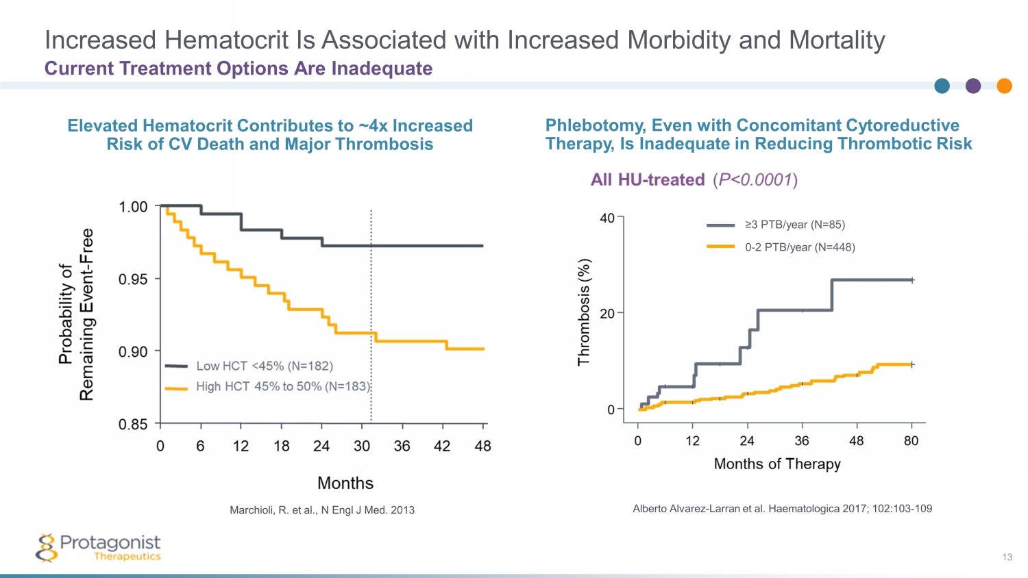 Only 22% of PV Patients Have Consistently Controlled Hematocrit 12 HCT is Not Managed to Guidelines, Regardless of Patients’ Risk Status Some or All Tests >45% All Tests <45% 22% 78% 85% 37% 53% 10% All HCT tests >50% Some HCT tests >50% All HCT tests <50% All HCT tests <45% Of the 78% of uncontrolled patients… Uncontrolled HCT >45% leads to a greater risk of thrombotic events, cardiovascular events, death, and may impact QoL 2 Analysis of real - world Symphony data from 2018 - 2019, including 4,264 PV patients with > 2 HCT tests following Tx initiation. Verstovsek S, et al. Blood. 2020 Nov; 136:1 - 2 supplement 1 (abstract published, m anuscript accepted for publication) 2. Marchioli R, et al. N Engl J Med 2013; 368:22 - 33. doi :10.1056/NEJMoa1208500 .