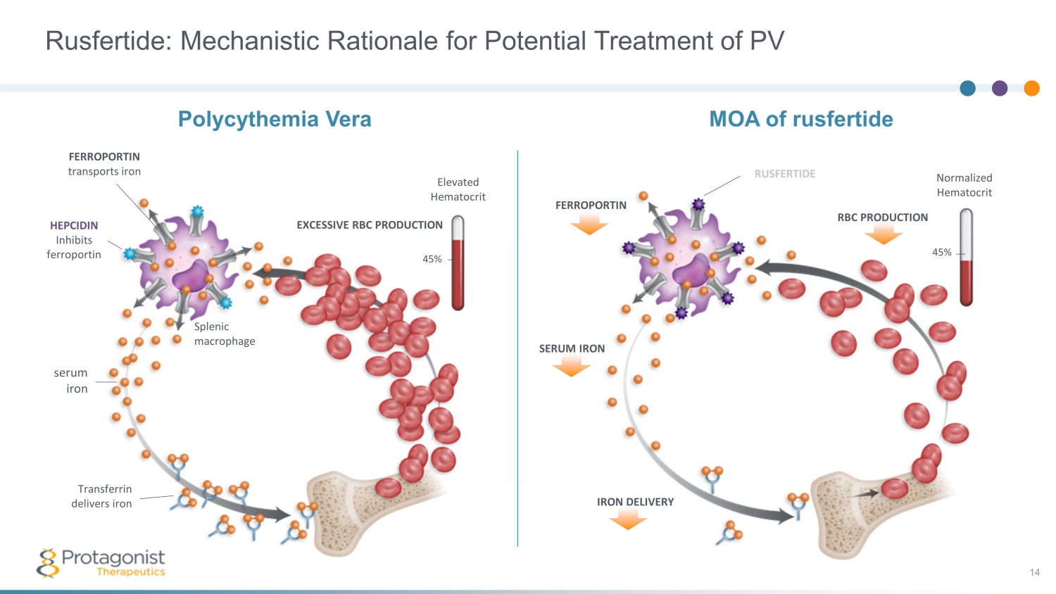 Polycythemia Vera • Burdensome symptoms including fatigue and concentration problems 2 – 84% of patients report fatigue, and 23% report spending full days in bed because of symptoms 3 • Impacts patient reported activities of daily living and reduce productivity 2 A Blood Disorder with Significant Unmet Needs with Current SOC 4 10 Maintaining HCT <45% is critical in PV, as per NCCN guidelines Uncontrolled HCT is associated with higher rates of death from cardiovascular causes or thrombotic events 1 Real world data shows that up to 78% of patients have uncontrolled HCT with tests > 45% 4 • Current standard of care (SOC) approaches are inadequate for HCT control and symptoms management 5 There is no available pharmaceutical option with RBC - specific mechanism to target HCT • Rusfertide is a mimetic of Hepcidin, the natural hormone regulating iron homeostasis and erythrocytosis 1. Marchioli R, et al. N Engl J Med 2013; 368:22 - 33. 2. Mesa R, et al. BMC Cancer. 2016;16,167. 3. MPN Landmark Survey, PV Report (2017). 4. Verstovsek S,, et al. Real - world treatments and thrombotic events in polycythemia vera patients in the USA. Ann Hematol . 2023 Mar;102(3):571 - 581. doi : 10.1007/s00277 - 023 - 05089 - 6. Epub 2023 Jan 13. PMID: 36637474; PMCID: PMC9977710. 2 1 3 4