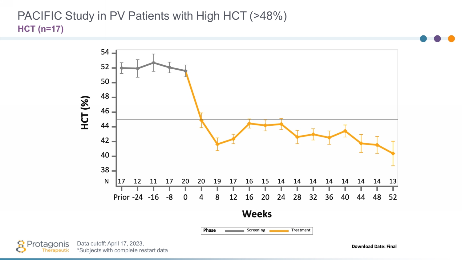 PACIFIC Study in PV Patients with High HCT (>48%) HCT (n=1 7 ) Data cutoff: April 1 7 , 202 3 , *Subjects with complete restart data