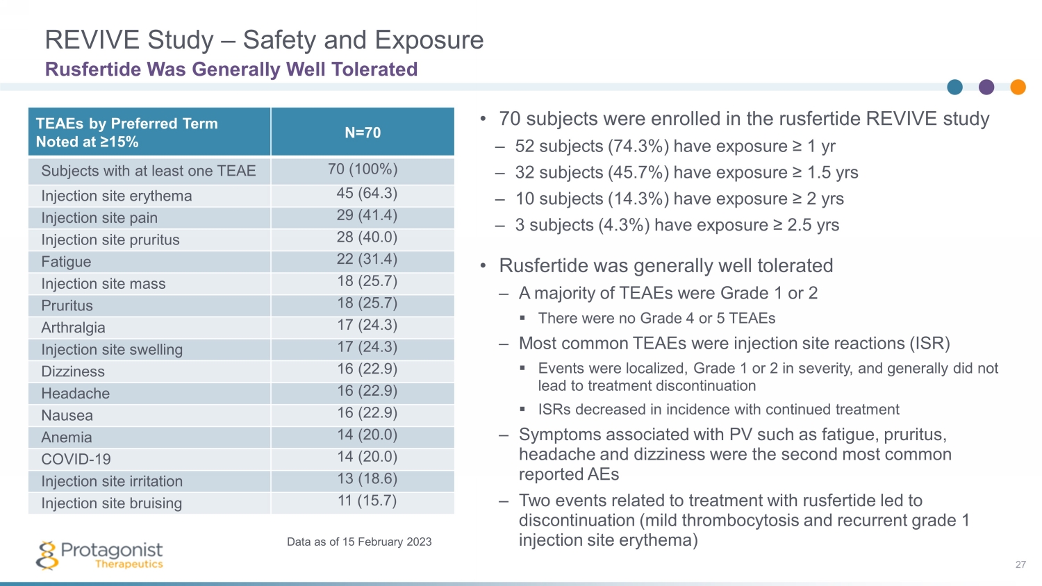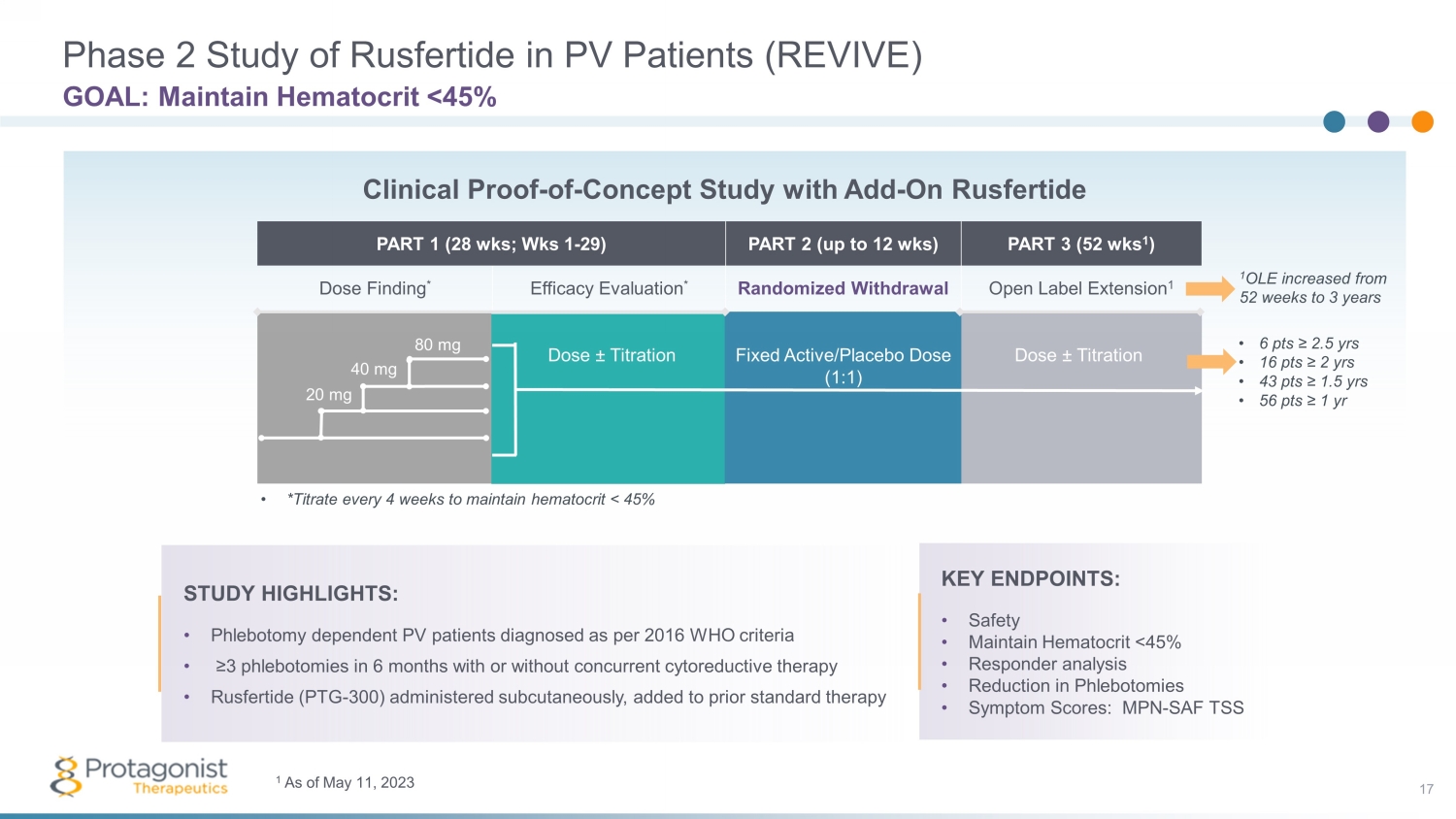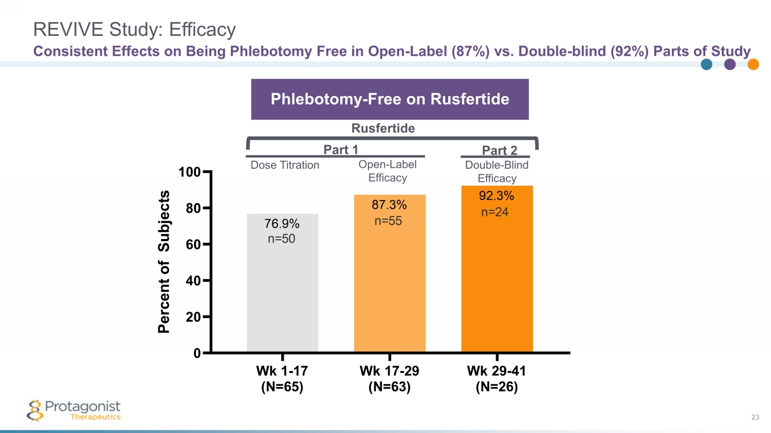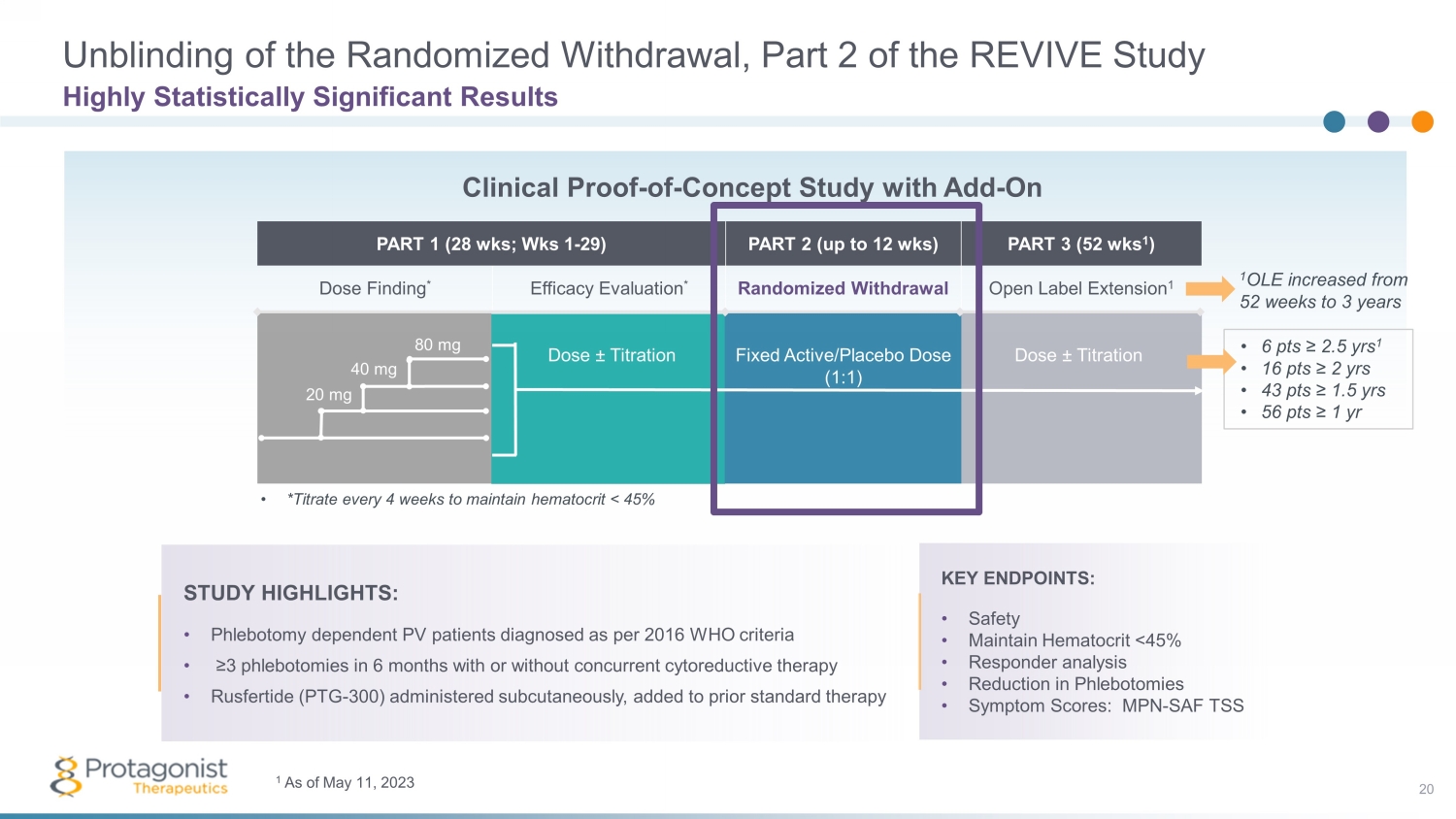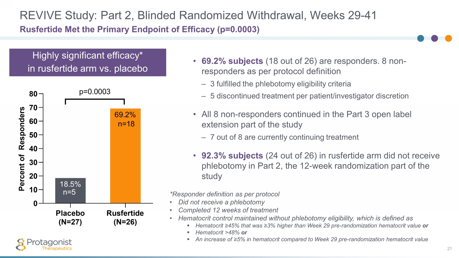 PART 1 (28 wks ; Wks 1 - 29) PART 2 (up to 12 wks ) PART 3 (52 wks 1 ) Dose Finding * Efficacy Evaluation * Randomized Withdrawal Open Label Extension 1 Unblinding of the Randomized Withdrawal, Part 2 of the REVIVE Study 20 Highly Statistically Significant Results Dose ± Titration Fixed Active/Placebo Dose (1:1) Dose ± Titration • *Titrate every 4 weeks to maintain hematocrit < 45% 20 mg 40 mg 80 mg Clinical Proof - of - Concept Study with Add - On KEY ENDPOINTS: • Safety • Maintain Hematocrit <45% • Responder analysis • Reduction in Phlebotomies • Symptom Scores: MPN - SAF TSS 1 OLE increased from 52 weeks to 3 years • 6 pts ≥ 2.5 yrs 1 • 16 pts ≥ 2 yrs • 43 pts ≥ 1.5 yrs • 56 pts ≥ 1 yr 1 As of May 11, 2023 STUDY HIGHLIGHTS: • Phlebotomy dependent PV patients diagnosed as per 2016 WHO criteria • ≥3 phlebotomies in 6 months with or without concurrent cytoreductive therapy • Rusfertide (PTG - 300) administered subcutaneously, added to prior standard therapy